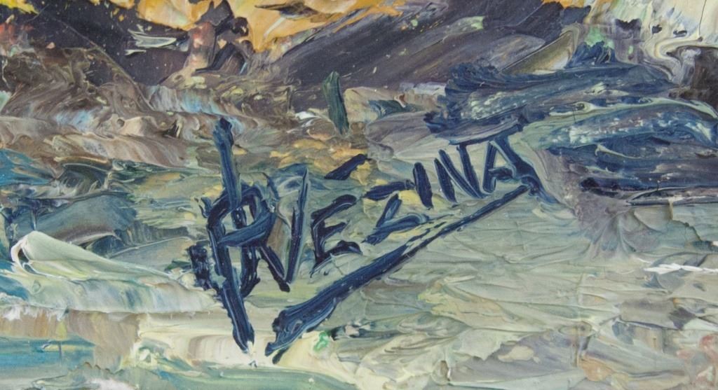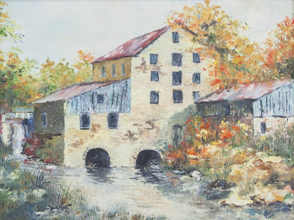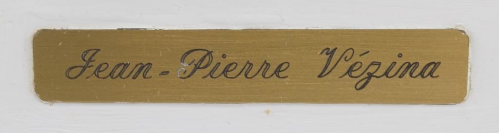 Oil on canvas, framed. Featuring brick house on a stream. Signed "JP Vezina" to the bottom right. Plaque reading "Jean-Pierre Vezina" attached to frame beneath image. Canvas size: 29 x 39 cm (11.5 x 15.5 inches). Frame size: 42.5 x 53 cm (16.75 x 21 inches).