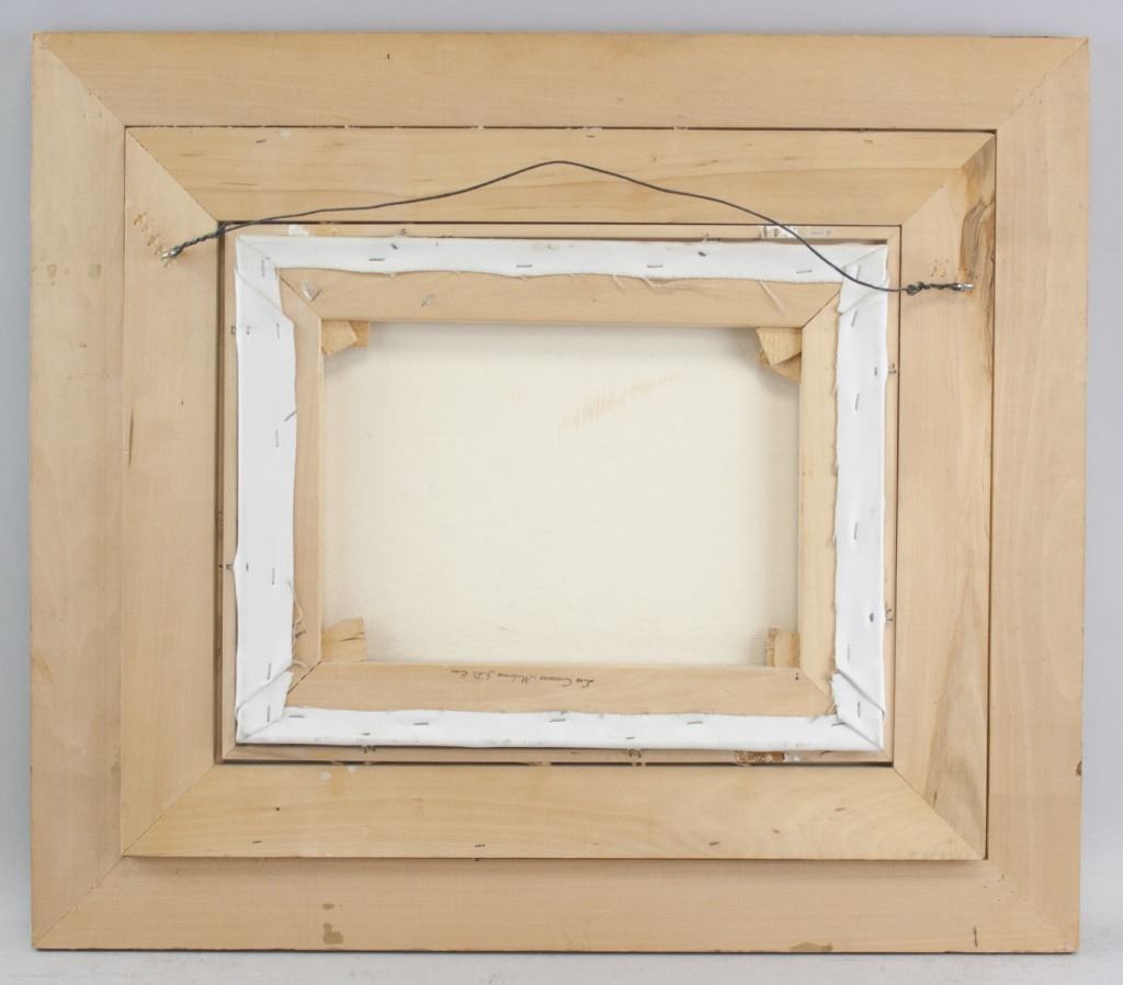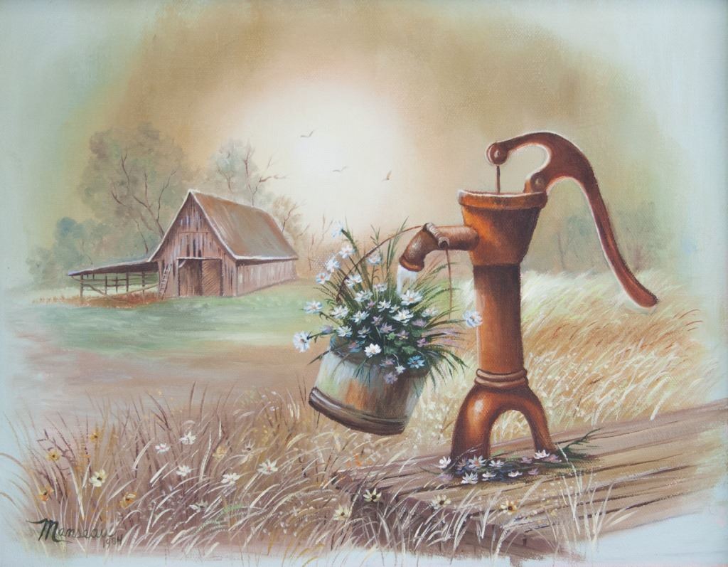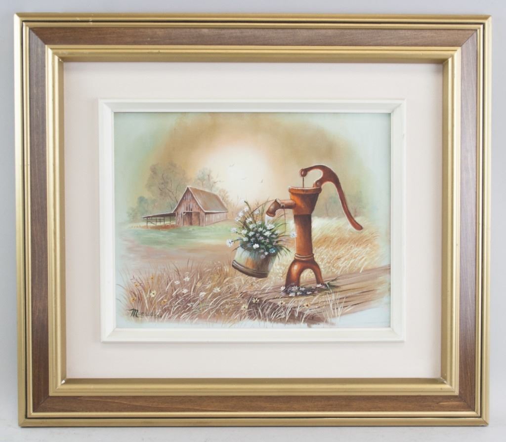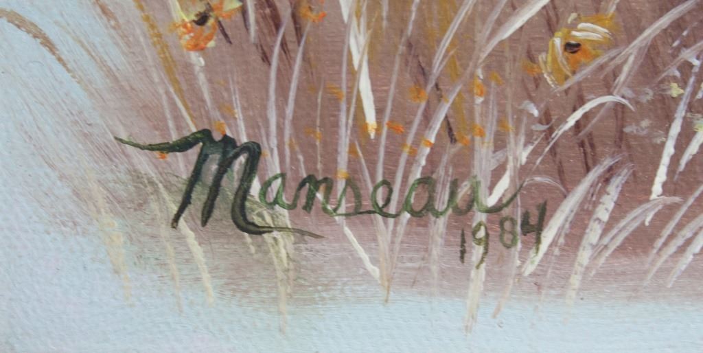 Oil on canvas, framed. Featuring landscape scene with a water pump in the foreground. A basket of flowers hangs from the pump. A farmhouse can be seen in the background. Signed "Manseau" to the bottom left corner. With "1984" inscribed near the signature. Canvas size: 27 x 34 cm (10.5 x 13.5 inches). Frame size: 51.5 x 59 cm (20.25 x 23.25 inches).