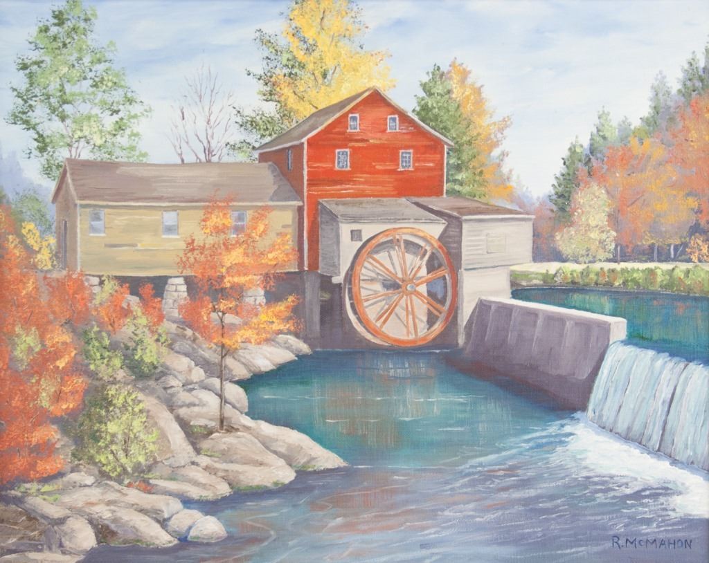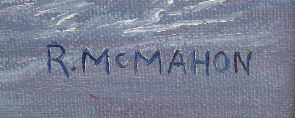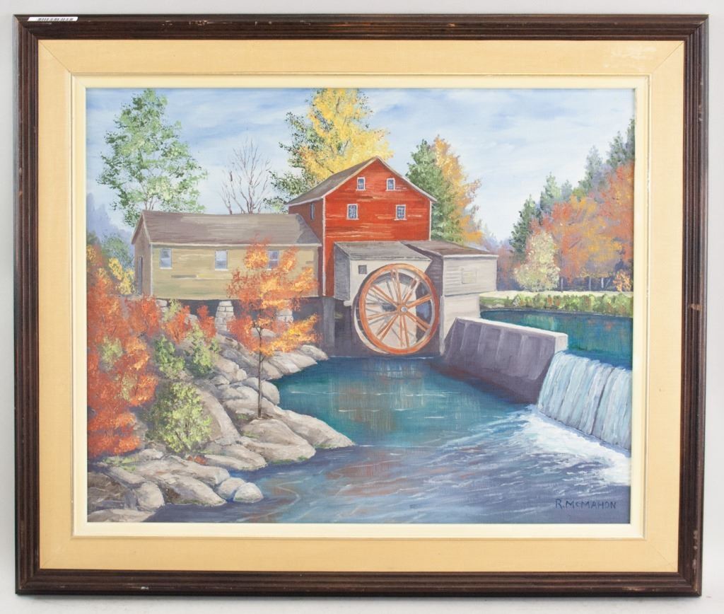 Oil on canvas, framed. Featuring house with a water wheel. Signed "R. McMahon" to the bottom right corner. Canvas size: 40 x 50 cm 916 x 19.5 inches). Frame size: 54 x 64 cm (21.25 x 25 inches).