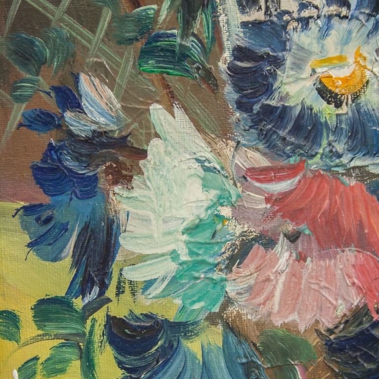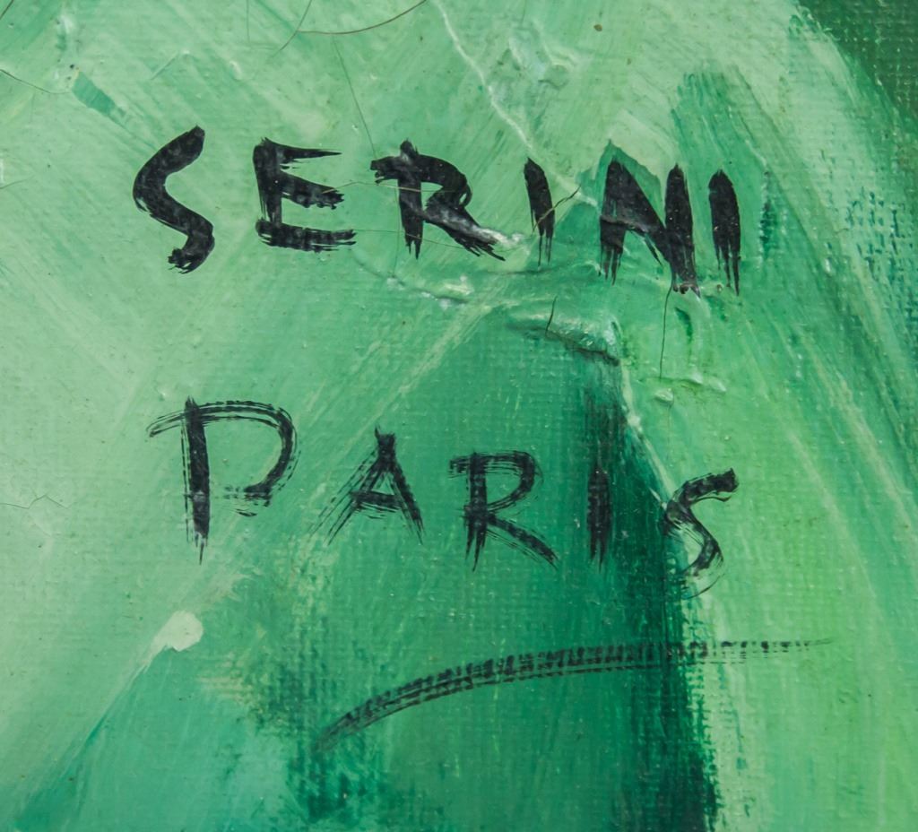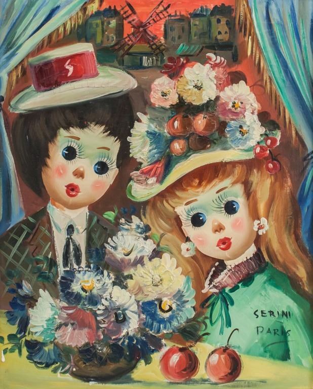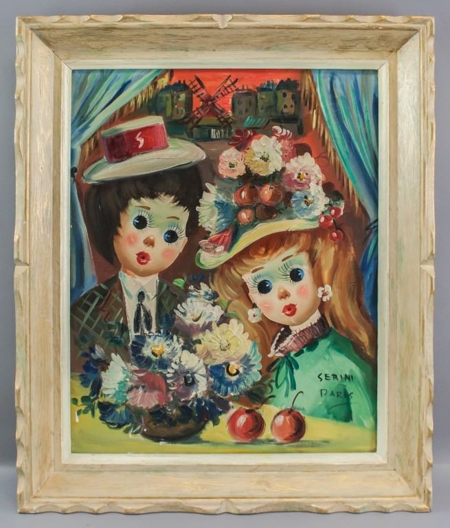 Oil on canvas, framed. Featuring portrait of two dolls looking at some flowers. Signed "Serini Paris" to the bottom right. Canvas size: 49 x 39 cm (19.5 x 15.5 inches). Frame size: 62 x 52 cm (24.5 x 20.5 inches).