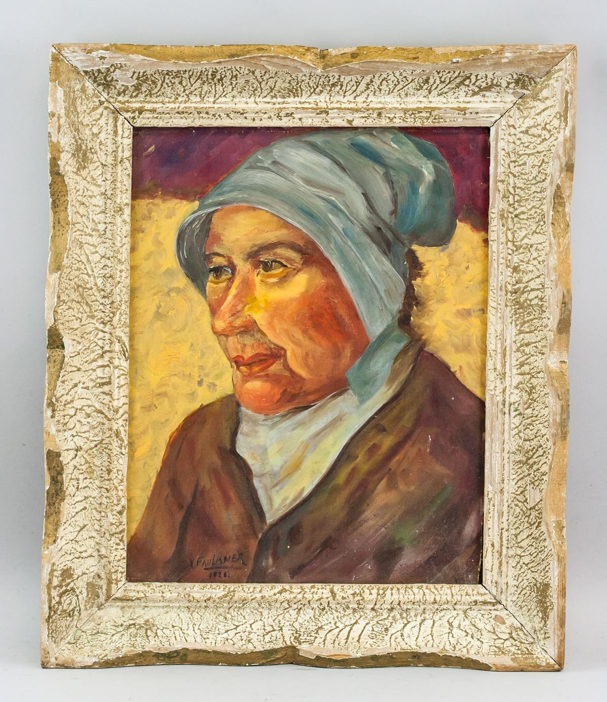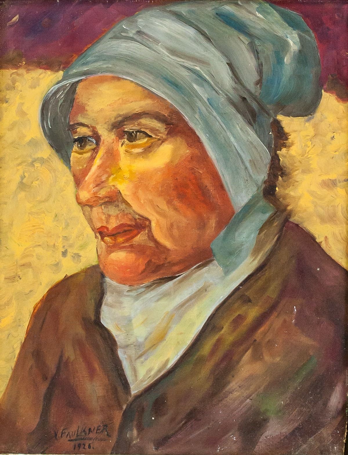 Oil on panel, framed. Featuring protrait of a woman. Signed V. Faulkner in the bottom left corner with 1926 inscribed beneath. Painted in the style of Vincent Van Gogh. 33.5 x 26 cm (13 x 10.25 in), Frame: 47 x 39 cm (18.5 x 15.4 in)