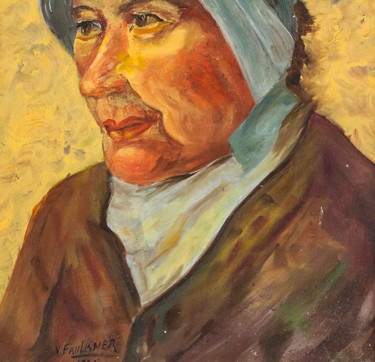 Oil on panel, framed. Featuring protrait of a woman. Signed V. Faulkner in the bottom left corner with 1926 inscribed beneath. Painted in the style of Vincent Van Gogh. 33.5 x 26 cm (13 x 10.25 in), Frame: 47 x 39 cm (18.5 x 15.4 in)