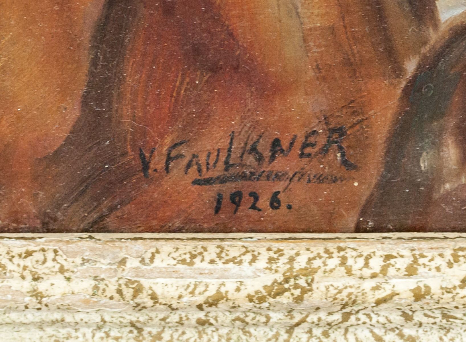 Oil on panel, framed. Featuring protrait of a woman. Signed V. Faulkner in the bottom left corner with 1926 inscribed beneath. Painted in the style of Vincent Van Gogh. 33.5 x 26 cm (13 x 10.25 in), Frame: 47 x 39 cm (18.5 x 15.4 in). Provenance: Toronto estate