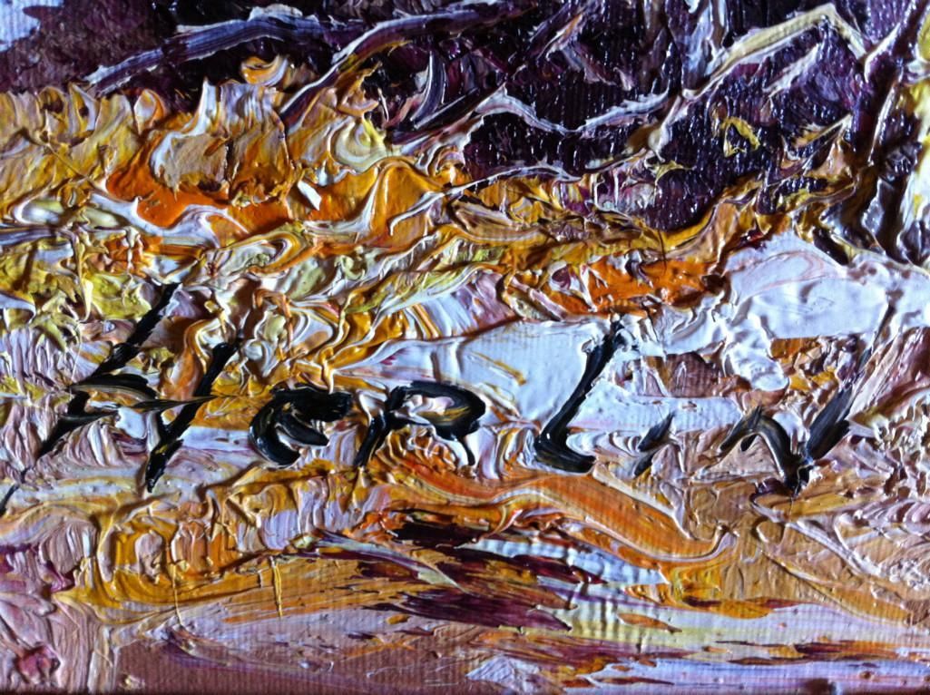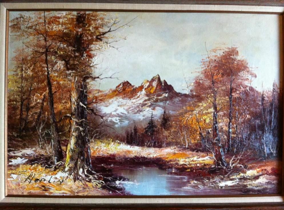 Oil on Canvas by Heplin Framed size: 43 1/2" x 31 1/2" This is a beautiful oil on canvas showing a seasonal time with the snow on the mountainside and around the woods and creek.