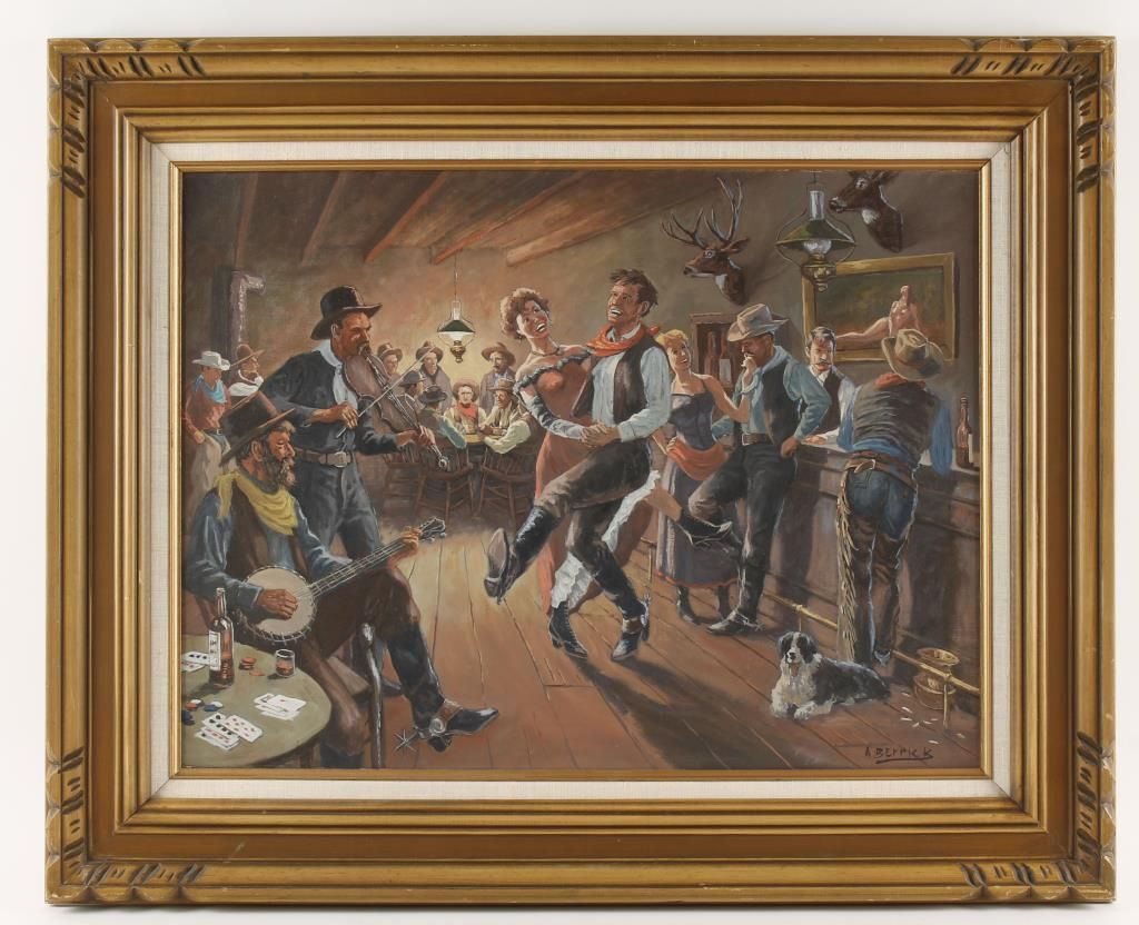 Depicting cowboy and saloon girl dancing in saloon. Signed lower right. Framed 31-1/2" wide x 25-1/2" high. Born just after the depression and searching for ways to express his love of the west Andrew moved west from Chicago to paint the west, and all it stands for. Located in Las Vegas, he has captivated collectors and art lovers the world over with his moving real to life compositions of the cowboy way of life. Oil is favorite medium that he strokes on to the canvas that eventually pulls the viewer back in time and often makes one feel like their in the scene. A long time fan of western literature Andrews action packed originals were frequently on the cover of popular magazines such as the TRUE WEST, BADMAN, OLD WEST and FRONTIER TIMES in the 70s and 80s. His popularity soared as he won various honors and awards in art shows in Nevada and the west. His works reflect the dynamic emotions in scenes similar to Remington and Russel as his style is more "loose" and invites the viewers appreciation to supplement the true emotion of realism that his work represents. Never a member of elite Cowboy Artists of America, Andrews originals are among the sought after echelon of old time cowboy artists that stood out and alone as well. "