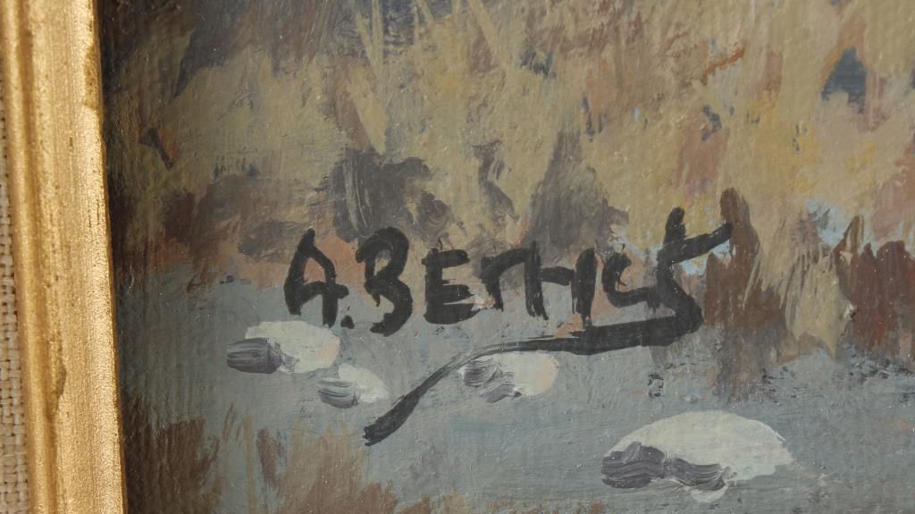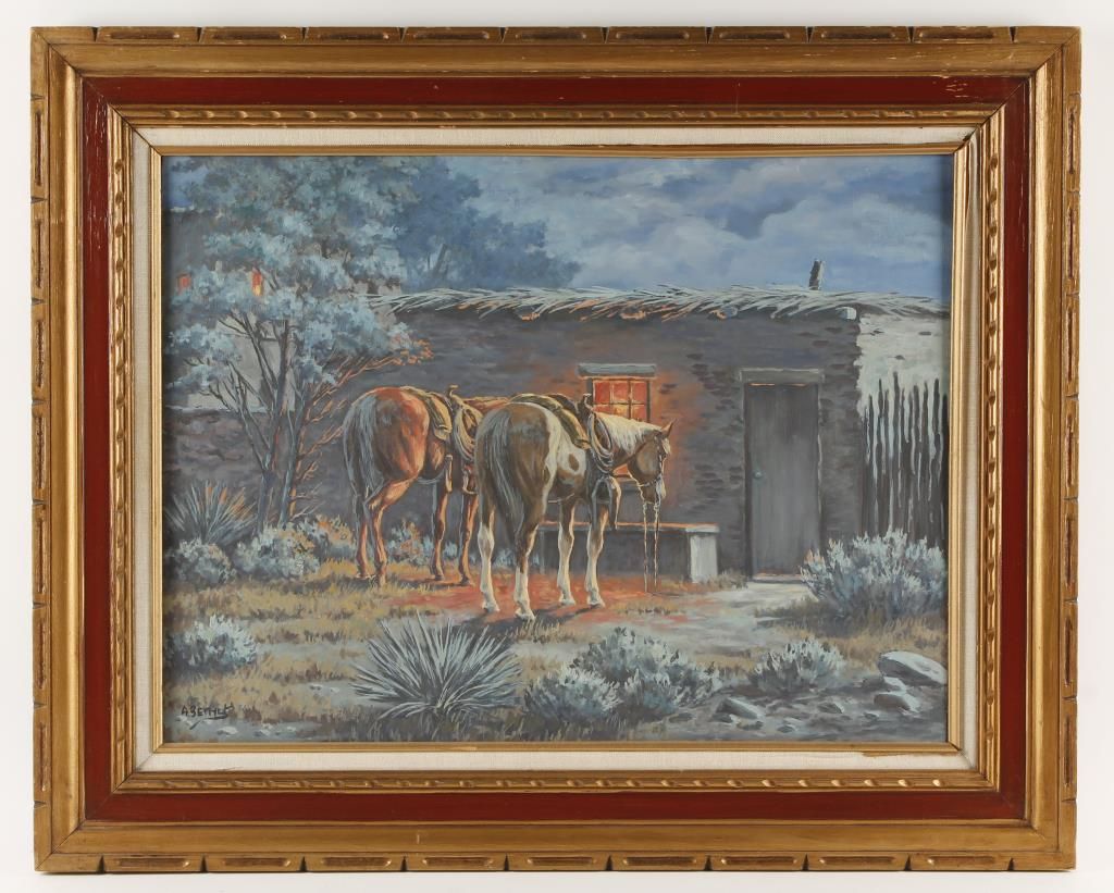 Depicting horses on hitching rail at night. Signed lower left corner. Image size 23-5/8" wide x 17-3/4" high. Framed, 31" wide x 25" high. Born just after the depression and searching for ways to express his love of the west Andrew moved west from Chicago to paint the west, and all it stands for. Located in Las Vegas, he has captivated collectors and art lovers the world over with his moving real to life compositions of the cowboy way of life. Oil is favorite medium that he strokes on to the canvas that eventually pulls the viewer back in time and often makes one feel like their in the scene. A long time fan of western literature Andrews action packed originals were frequently on the cover of popular magazines such as the TRUE WEST, BADMAN, OLD WEST and FRONTIER TIMES in the 70s and 80s. His popularity soared as he won various honors and awards in art shows in Nevada and the west. His works reflect the dynamic emotions in scenes similar to Remington and Russel as his style is more "loose" and invites the viewers appreciation to supplement the true emotion of realism that his work represents. Never a member of elite Cowboy Artists of America, Andrews originals are among the sought after echelon of old time cowboy artists that stood out and alone as well. "
