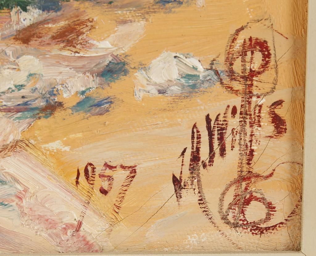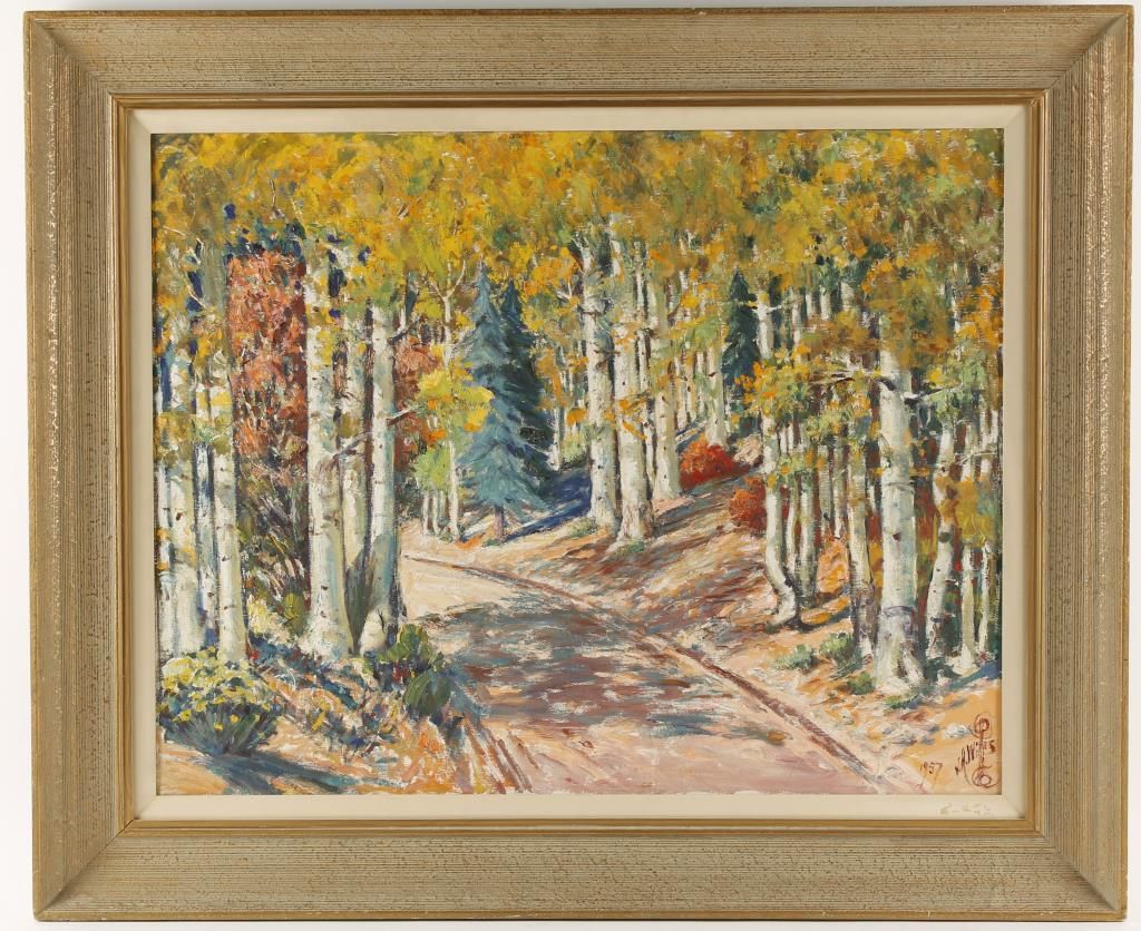 Signed lower right, 1957. Depicting birch and pine trees. Oil starting showing crackalure. Image size 27-1/2" wide x 21-1/2" high. Framed 23-1/2" high x 29" wide. Joseph Roy (J. R.) Willis (1876-1960) is best known for his Indian photographs and paintings and Southwestern landscapes. Willis traveled throughout the Southeastern part of the United States where he took advantage of the beauty of the region to paint many portraits and landscapes. Near the end of his life, he was faced with failing eyesight, but continued to paint until the time of his death. His career began as a political cartoonist during the Spanish American War. He worked at the "Atlanta Constitution" newspaper before going to New York to study art about 1908. Then he went to California, where he was a pioneer in the cartoon industry. He also spent 10 years as a "chalk talk" artist in Vaudeville. Willis was known as the "Aspen King" because of his many paintings of the beautiful aspen trees which turn a golden color in the fall of the year. He was also known for his portraits of American Indians, principally of New Mexico and Arizona. His work was realistic in style. His style is very similar to Frederic Remington and Charles Russell. He studied with Robert Henri in New York. Photography was another medium for which he was well known. Many of the photographs were used to make view- master reels and post cards, which have become quite collectible today. In addition to the Albuquerque Museum, his work is found in a Japanese museum in Imabari, Shikoku and a museum in Valledupar, Cesar, Colombia, South America. Many pieces of his work are in private collections in this country and Germany.