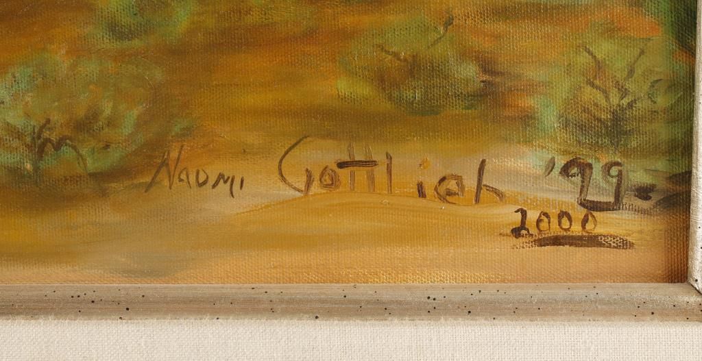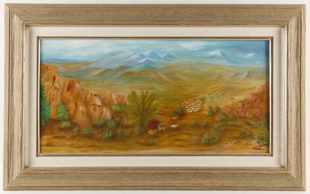 Depicting landscape with sheep and woman. Signed lower right. Image size 29-1/2" wide x 14-1/2" high. Framed, 38-3/4" wide x 24" high.