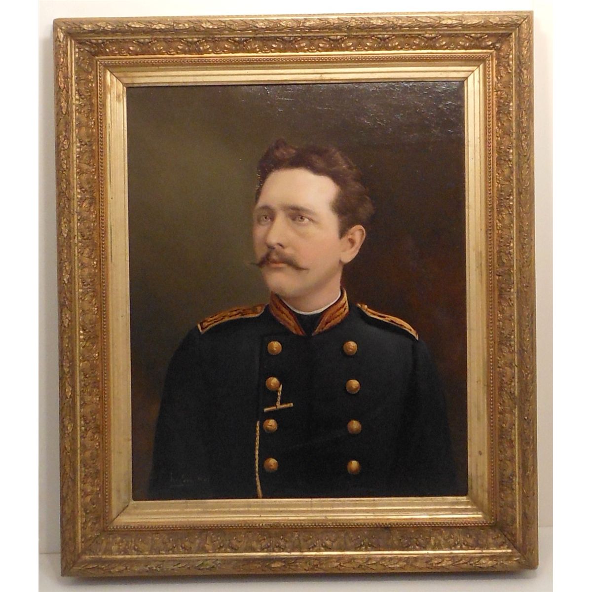 20" x 24" in a deep 27" x 32" gold gilt frame, signed Leclerc? And dated 1901, portrait of a French Officer. Painting in good condition with a large repair. Frame has some loss and heavy cracking.
