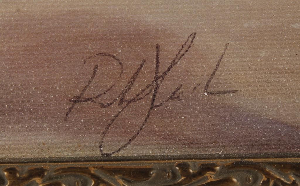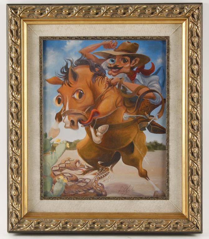 Caricature style painting of a man on horse. Signed lower right corner. Image size 10-1/2" wide x 13-1/2" high. In wooden gold wash frame 17" wide x 19-3/4" high.