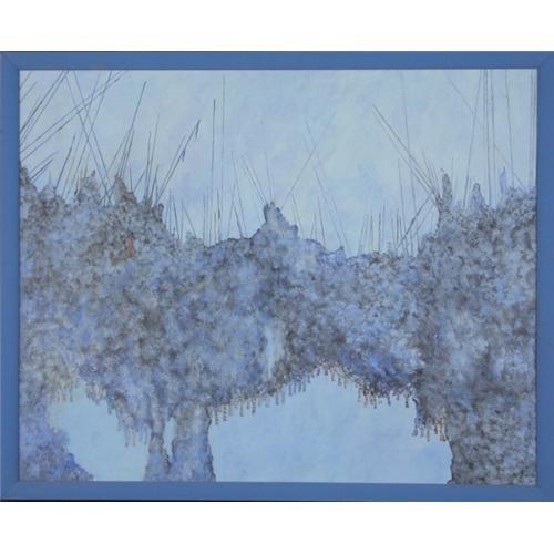 This is an exquisitely unique oil paintings that demonstrates the artist?s ability to control color and paint. It is full of dramatic contrast as well as subtle tonal changes. This painting is attractively framed in a blue wooden frame that enhances the bold blue of the painting and makes the entire piece measure 25? x 31?.