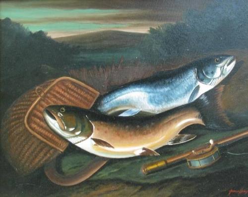 Oil on board , 15 in. x 20 in. of a rod and creel with two fish on the river bank by Jerome Howes, Great color and depth. Signed lower right. Nicely framed. (decoy)