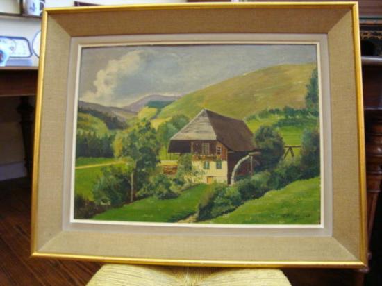 Painting dated 1947, Oil on board "French Alsatian countryside in the 1940's" signed by French artist F. Muller. H: 22" W: 27.25" with frame (H: 16" W: 21" for the painting). The scene for this painting is an Alsatian house and countryside with mountains on the back. On the bottom right, you can see the signature of artist (see photo #2). A small price for a very nice piece of art! Very good condition !!! For the shipping...don't worry, we ship from Texas (not from France)!