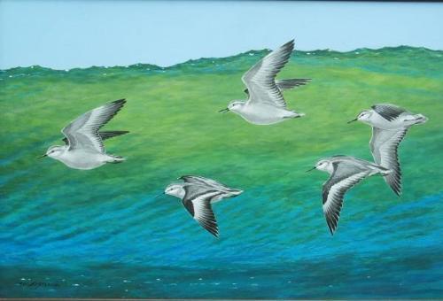 Oil on board, approx 23 in.x 34 in., of five sandpipers in flight with the crest of an ocean wave in the background by Timothy A. Eastland, Old Lyme, CT. XOC, beautiful color, nicely framed. Signed on the lower left. (decoy)