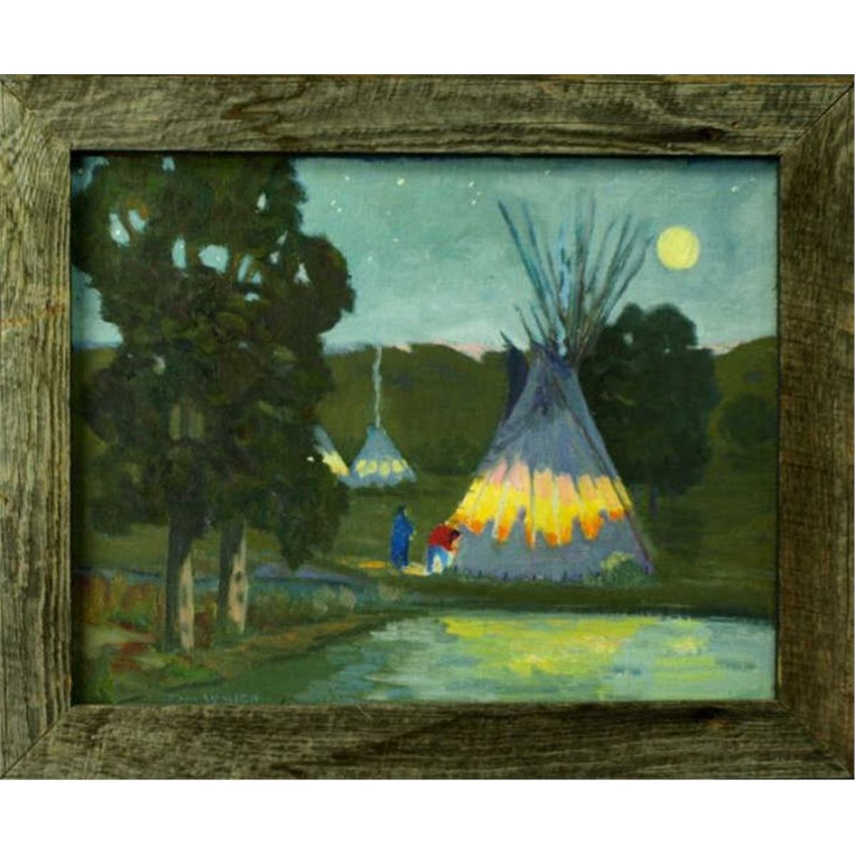 Oil on board by Tom Waugh C. 1984, 10 1/2" X 4 1/2" depicting a teepee scene.