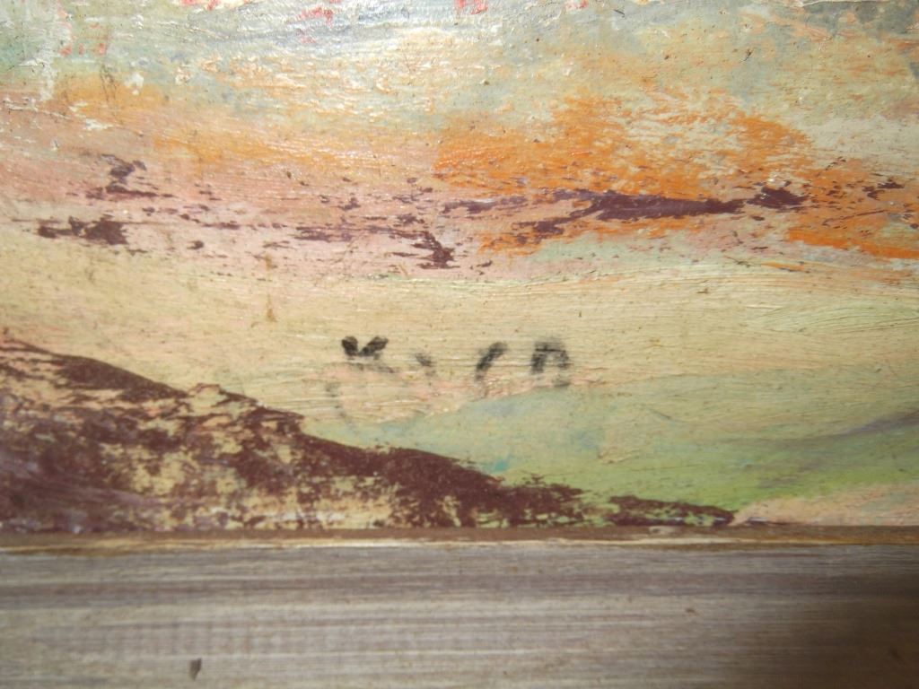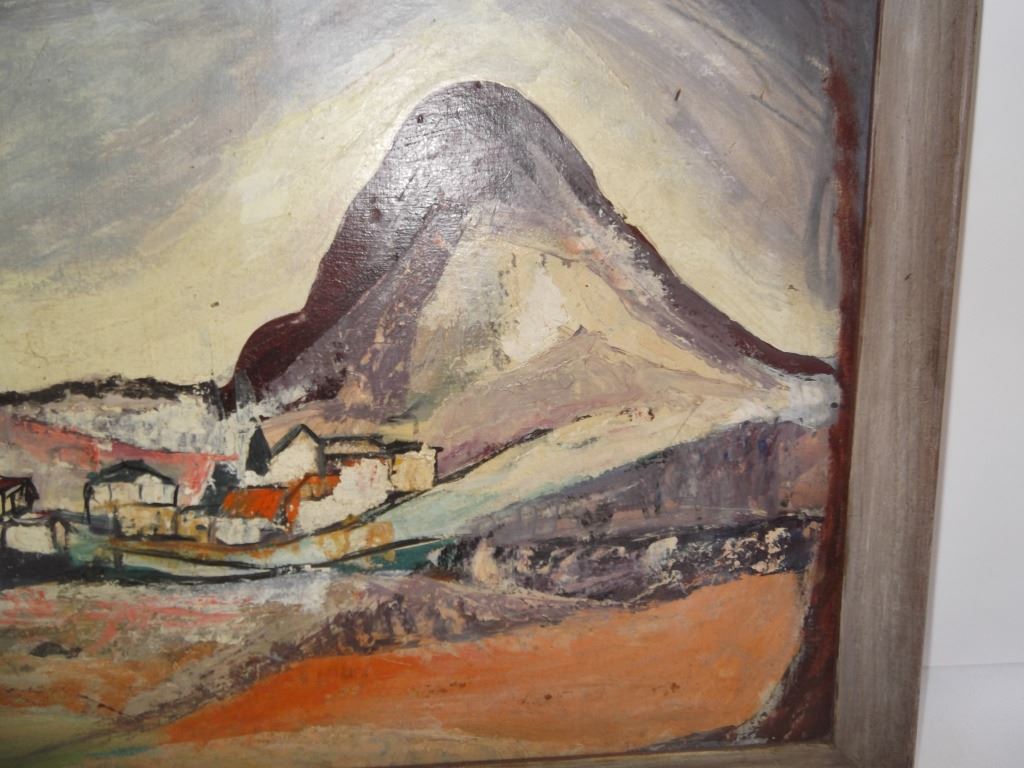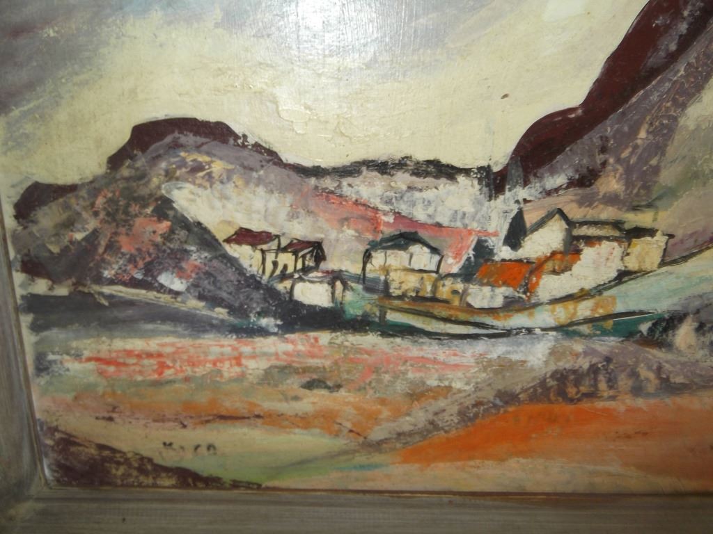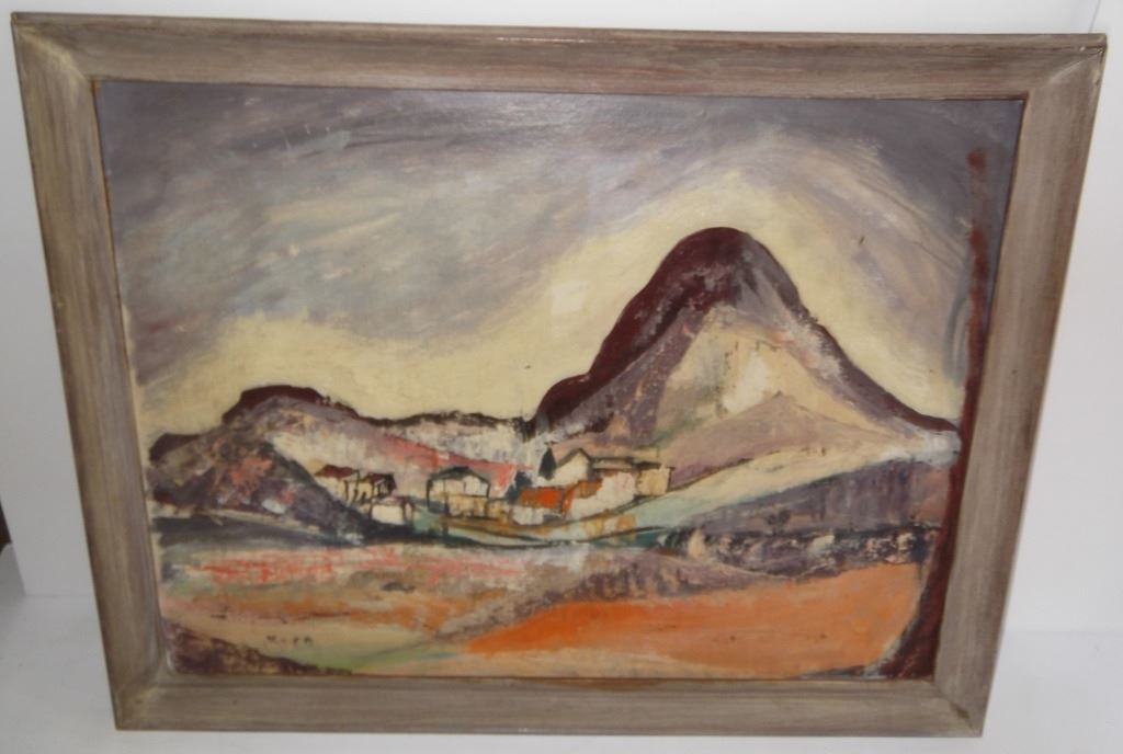 Oil on board houses in valley scene, signed illeg. 26 1/2 inches x 20 1/2 inches.