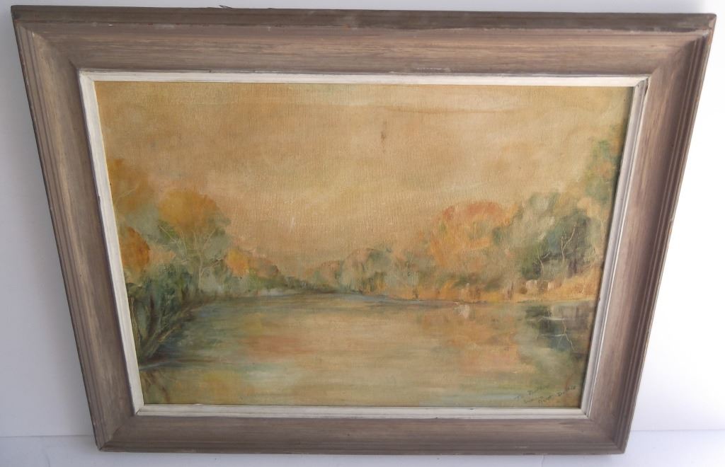 Oil on board lake scene dedicated "To Bethie, from Aunt Dottie". 19 1/2 inches x 16 inches.