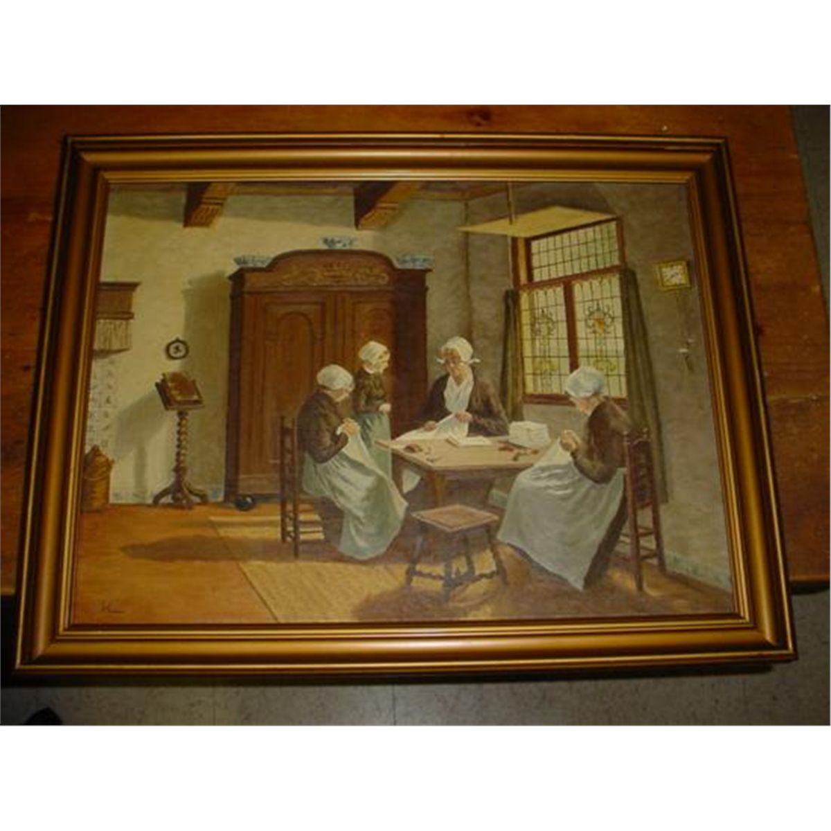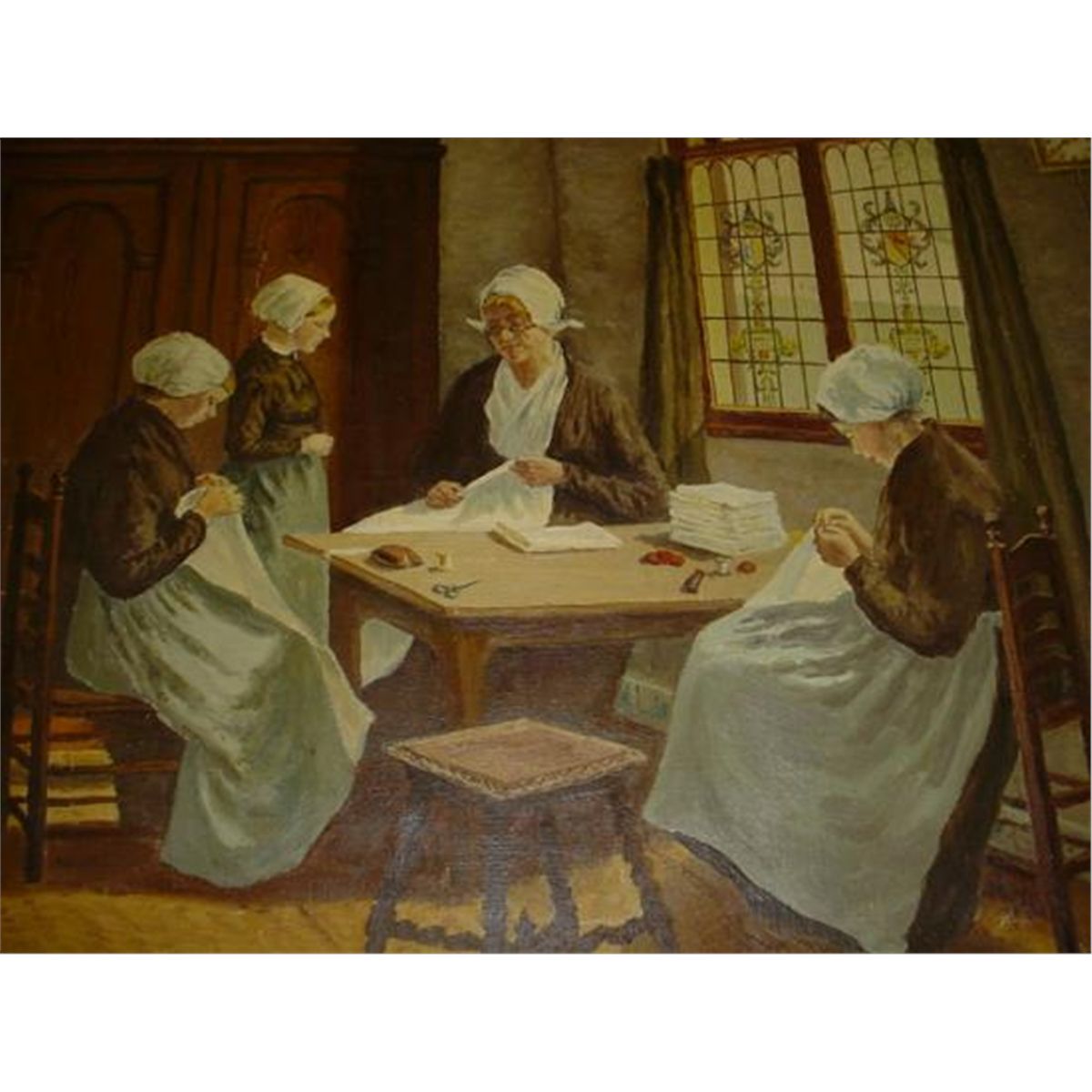 Painting, Oil on canvas "Maids at work" signed HL. H: 23" W: 29.5" with frame (H: 20" W: 26" for the painting). The scene for this painting is maids at work, probably in Northern France. On the bottom left, you can see the signature of artist (see photo #2). A small price for this nice piece of art! Very good condition !!! For the shipping...don't worry, we ship from Texas (not from France)!