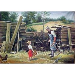 Oil on canvas, The Country Joiner", signed (lower right), unreadable, image measures 22 1/4" x 32" Estimate 200/400