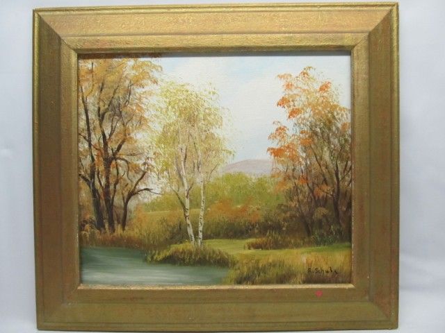 Oil on canvas by R. Schul, "Autumn at the riverbank" 13 1/2 by 12 inches.
