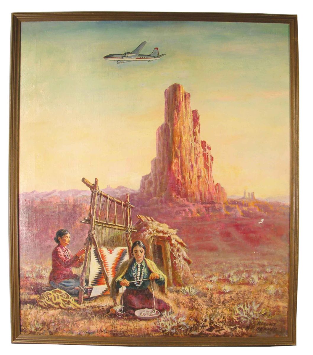 Oil on canvas by Robert Benney (1904-2001). Depicting Navajo Rug Weavers with a DC-7 airplane flying overhead. Illustration used for advertising dated 1953. Mr. Benney was a prolific artist/illustrator from New York. Couple of minor scratches otherwise excellent condition. 25 1/2 X 29 1/2 inches.