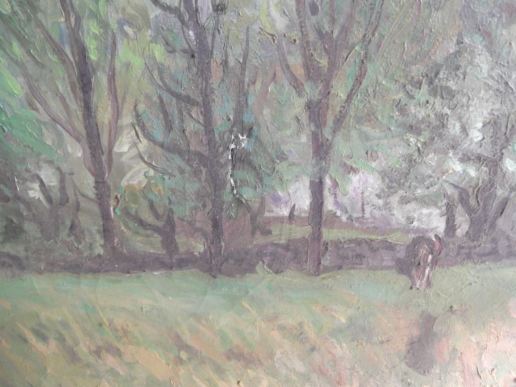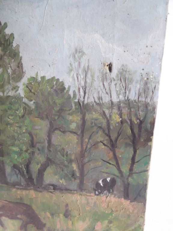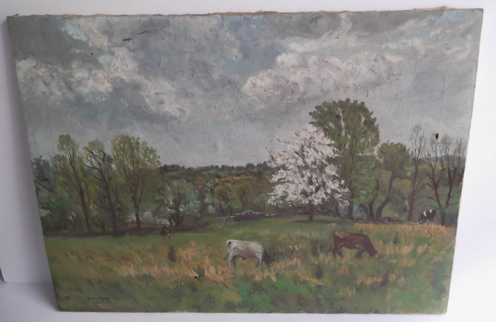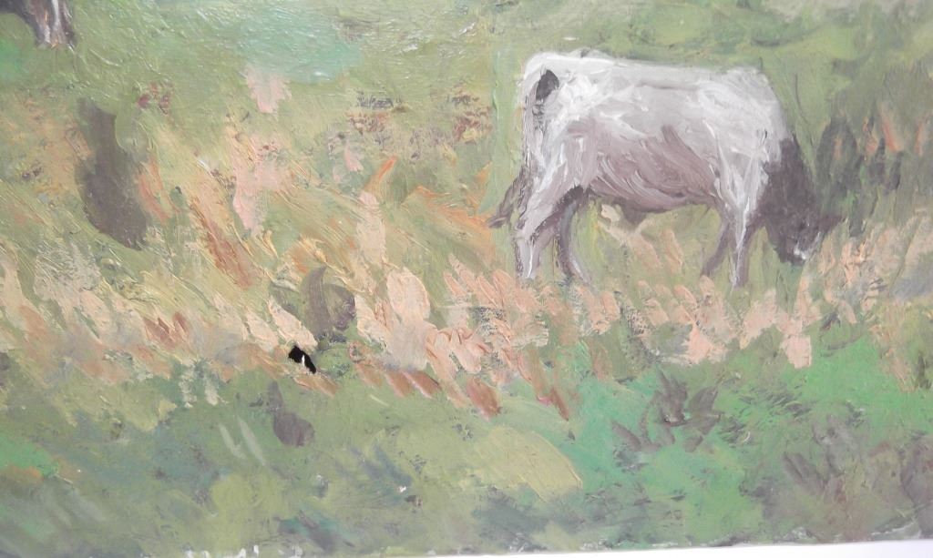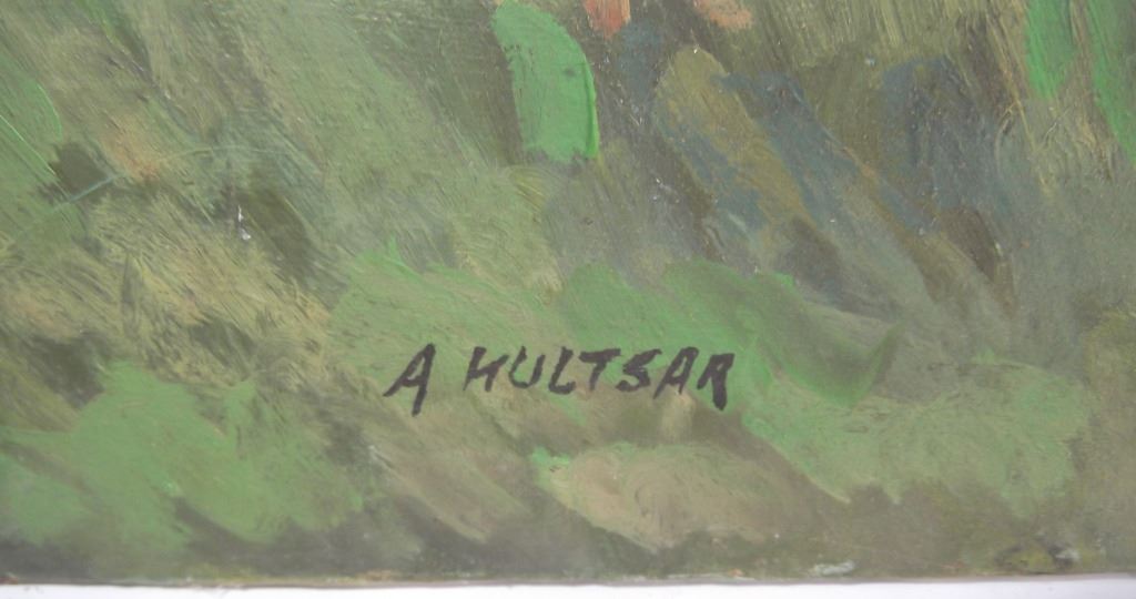 Oil on canvas cows in field scene, signed A. Hultsar. Several holes/tears; stains. 24 inches 18 inches.