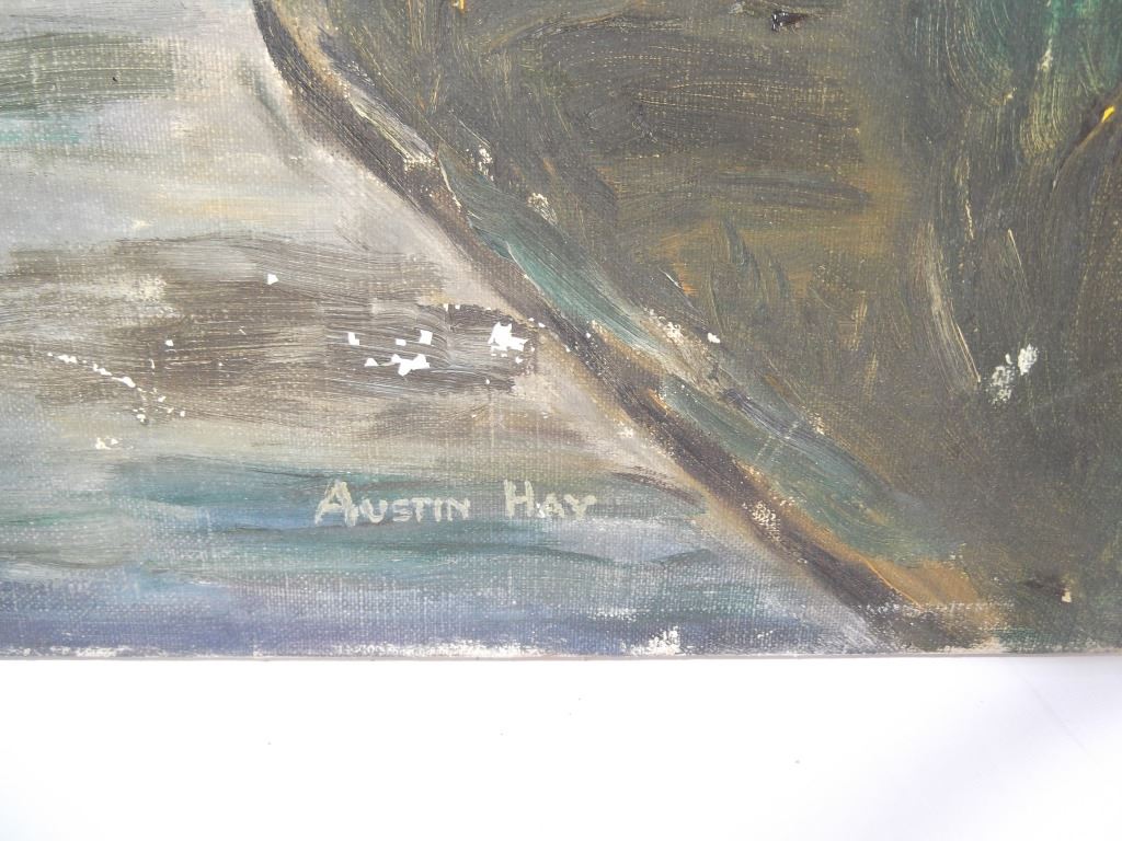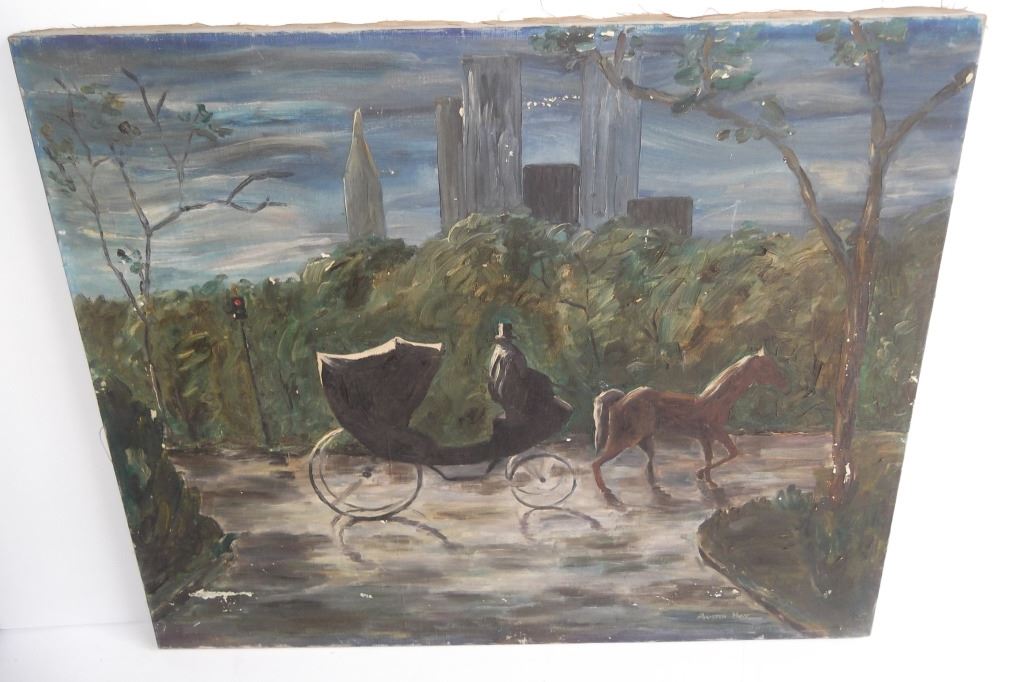 Oil on canvas horse & buggy in park scene signed Austin Hay. Scratches; paint flaking. 20 inches x 24 inches.