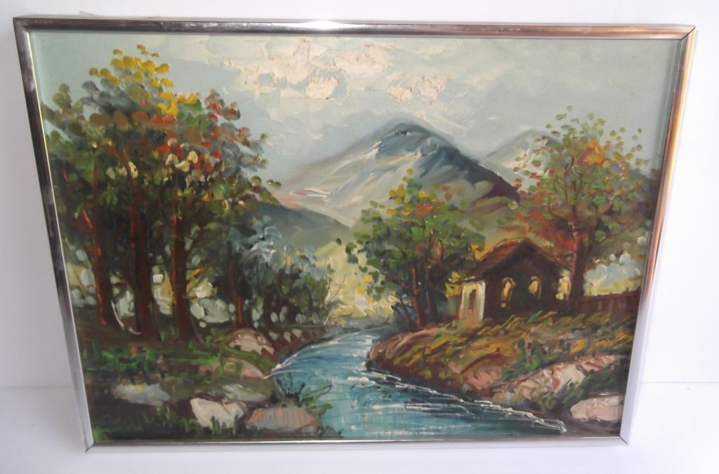 Oil on canvas house by stream scene, unsigned. 16 1/4 inches x 12 1/4 inches.