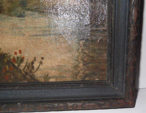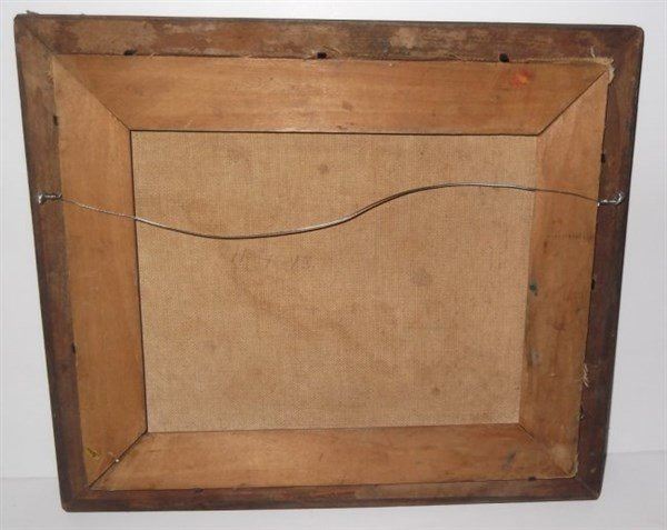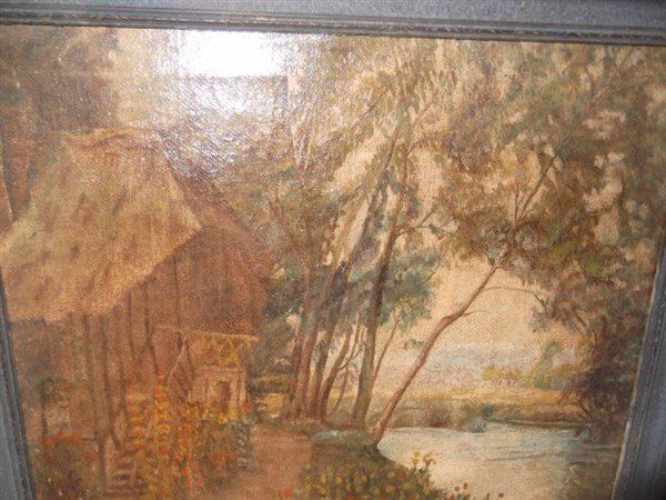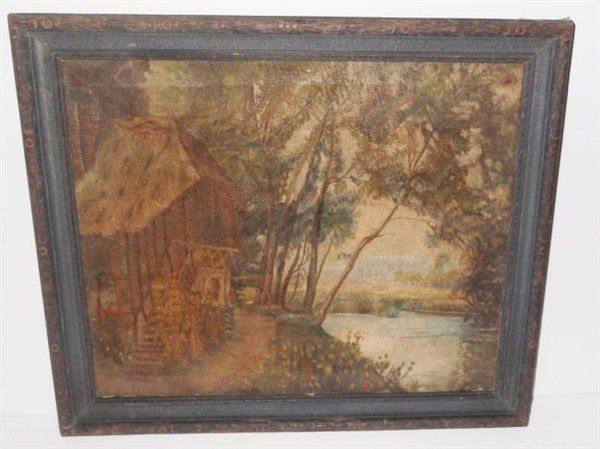 Oil on canvas hut scene by water, unsigned. 13 3/4 inches x 11 3/4 inches.