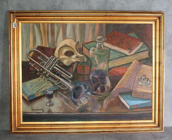 Oil on canvas in a giltwood frame of items on a desk top signed lower left.H:36.5" W:47"