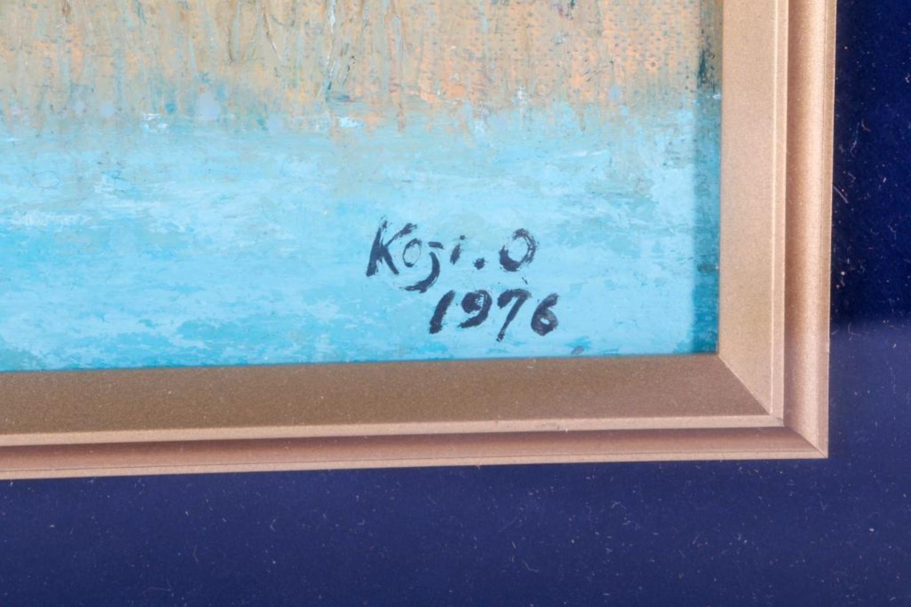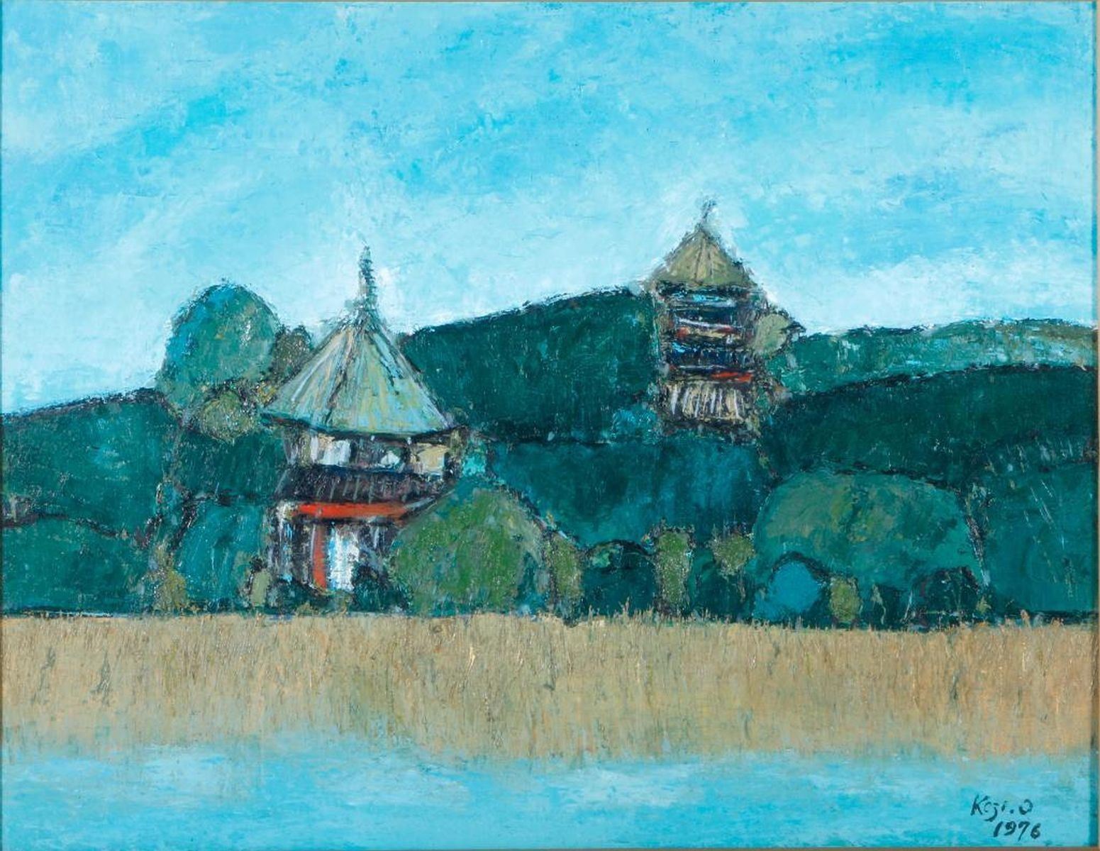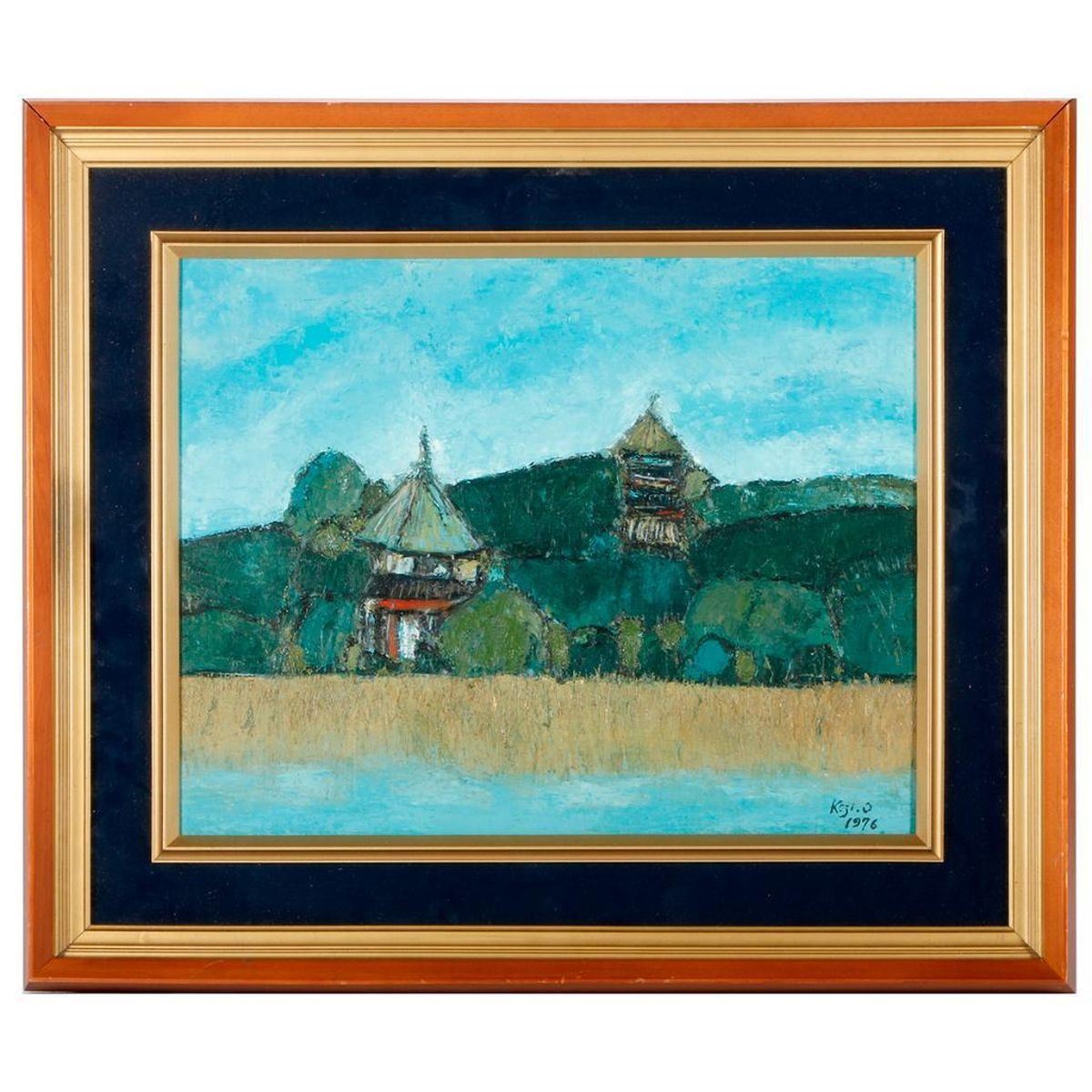 Artist: Kogi.O (signed lower right). Subject/Title: Landscape with farm houses. Date Created: 1976. Medium: Oil on canvas. Size Image: 13 inches high x 16. Size Frame: 19 inches high x 22 1/2. Condition: Good.