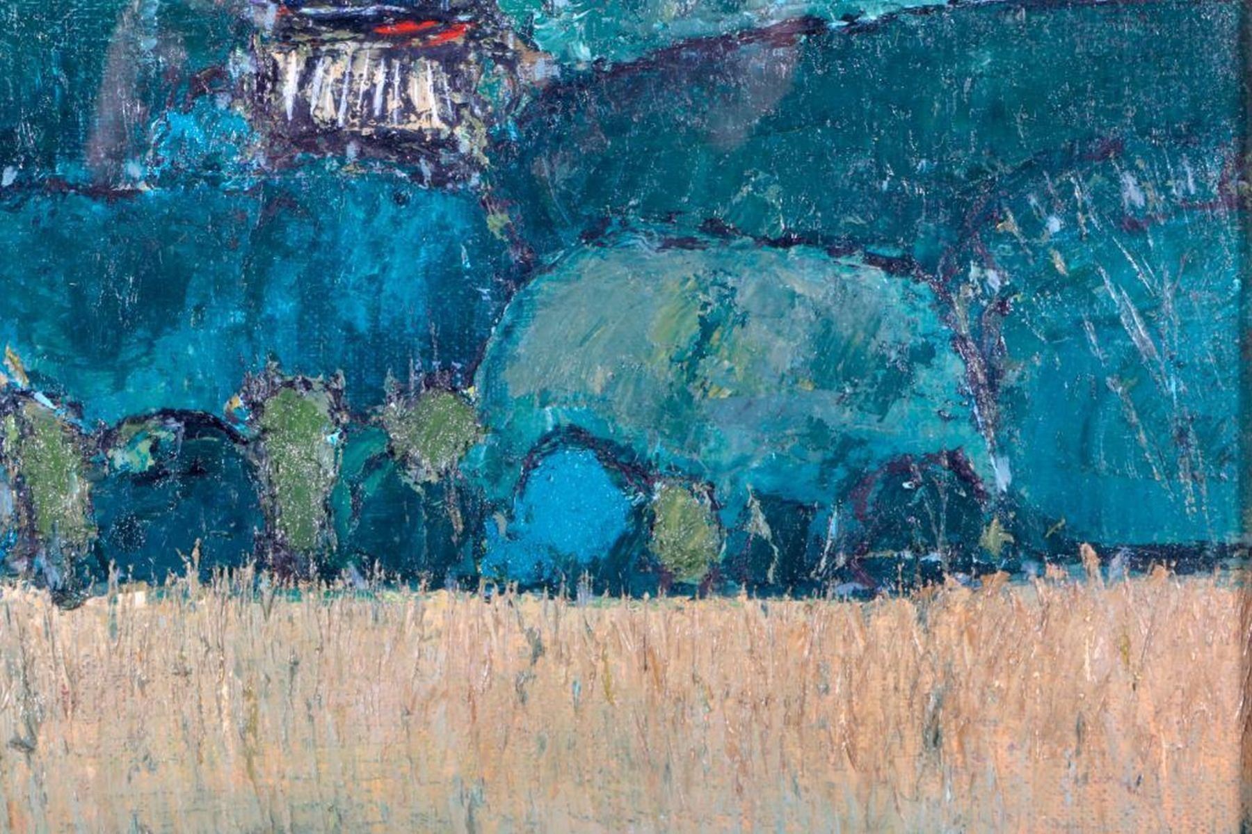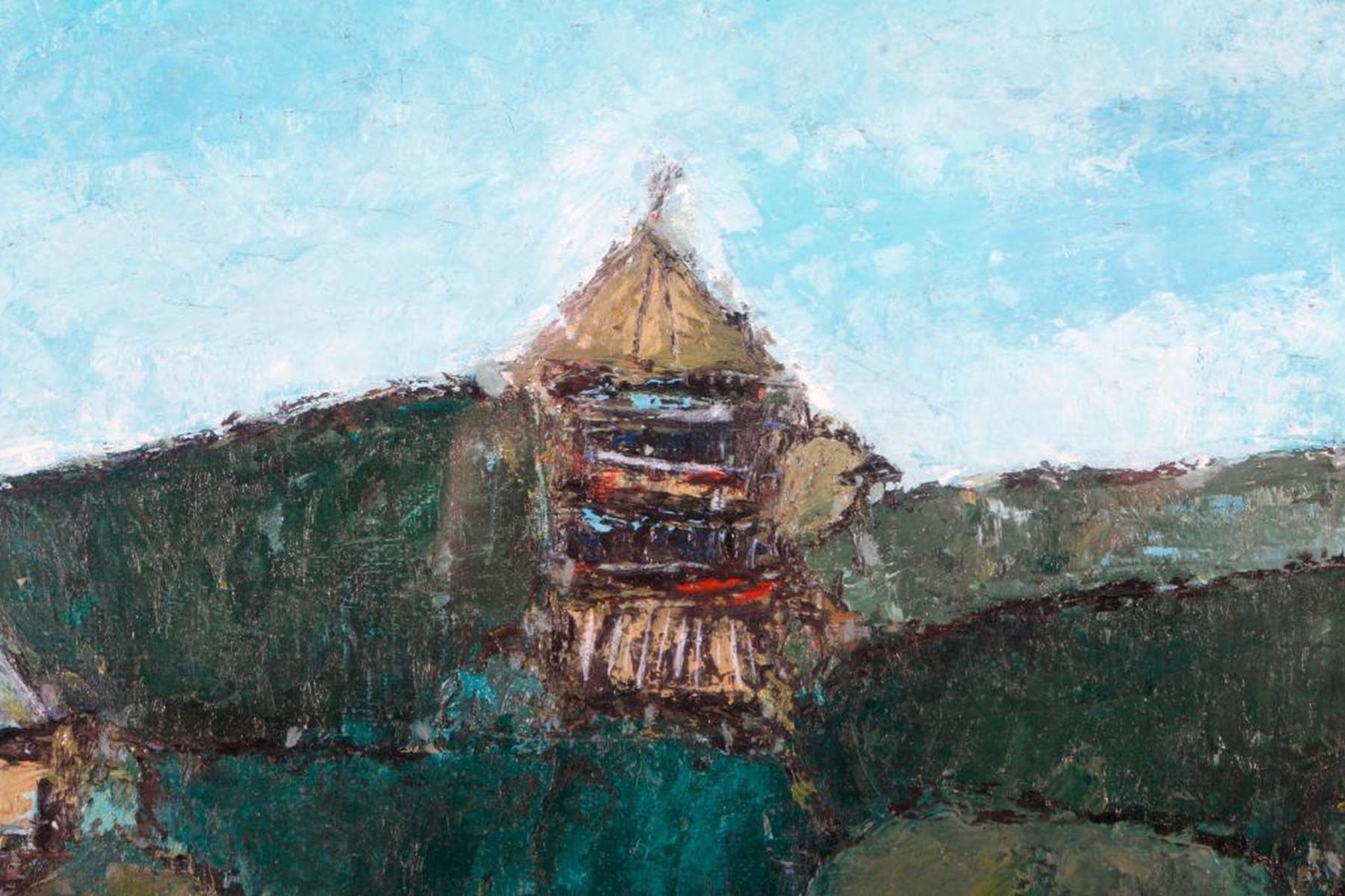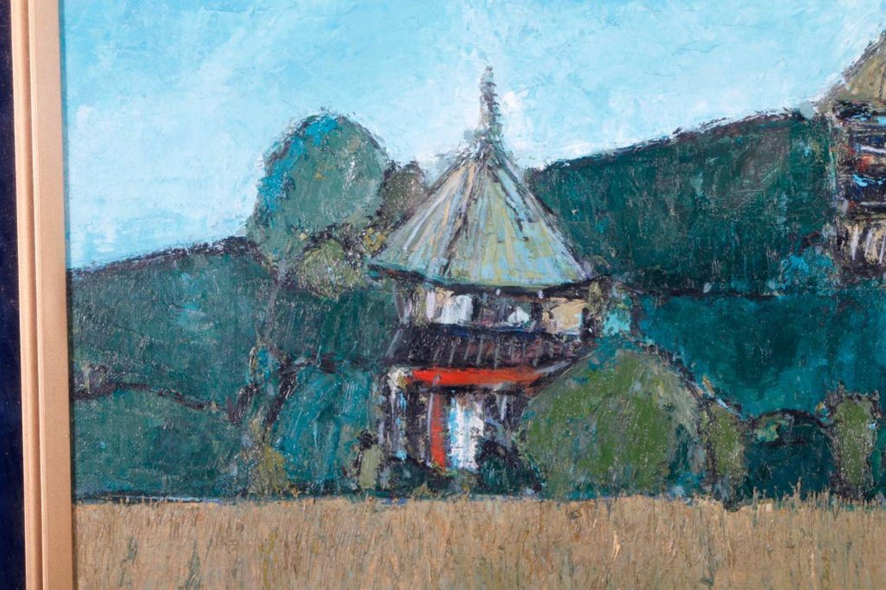 Artist: Kogi.O (signed lower right). Subject/Title: Landscape with farm houses. Date Created: 1976. Medium: Oil on canvas. Size Image: 13 inches high x 16. Size Frame: 19 inches high x 22 1/2. Condition: Good.