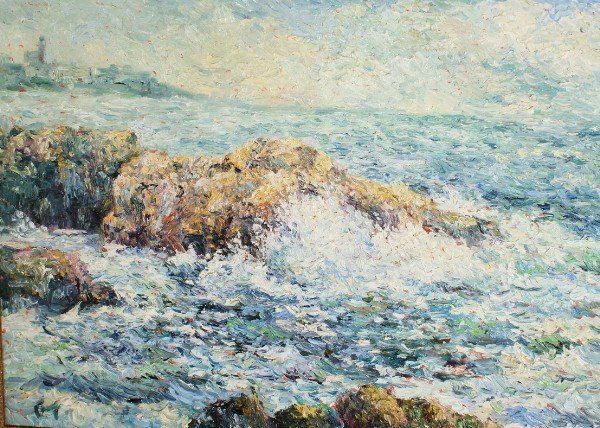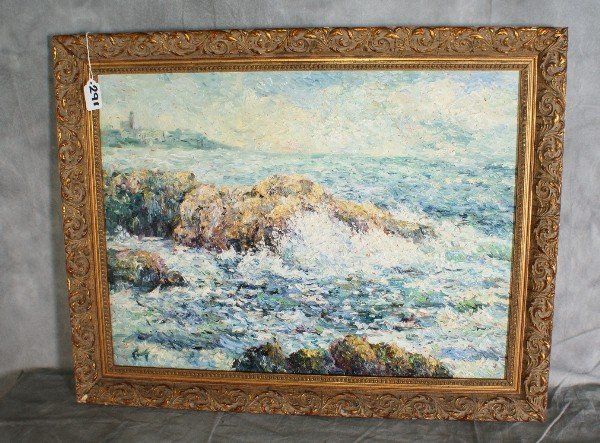 Oil on canvas of waves crashing the rocks signed lower left. H:22.5" W:28"