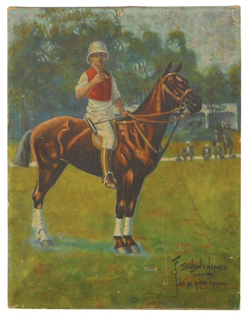 Oil on canvas original art for Benson & Hedges Cigarettes, signed "T. Benson & Hedges Cigarettes with the Artists Compliments", needs cleaning, o/wise in VG orig cond, 16"H x 12"W.