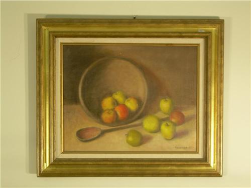 Oil on canvas, still life, apples in a bowl, signed ''Heinrich '85,'' in a gilt frame