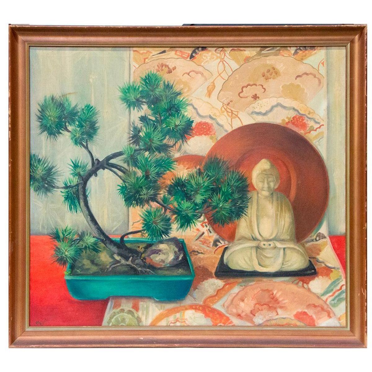 Artist: Signature illegible (lower left). Subject/Title: Still life. Date Created: Mid 20th century. Medium: Oil on canvas. Size Image: 36 inches high x 40. Size Frame: 40 3/4 inches high x 45. Condition: Good.