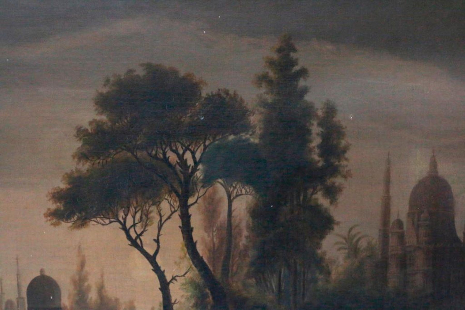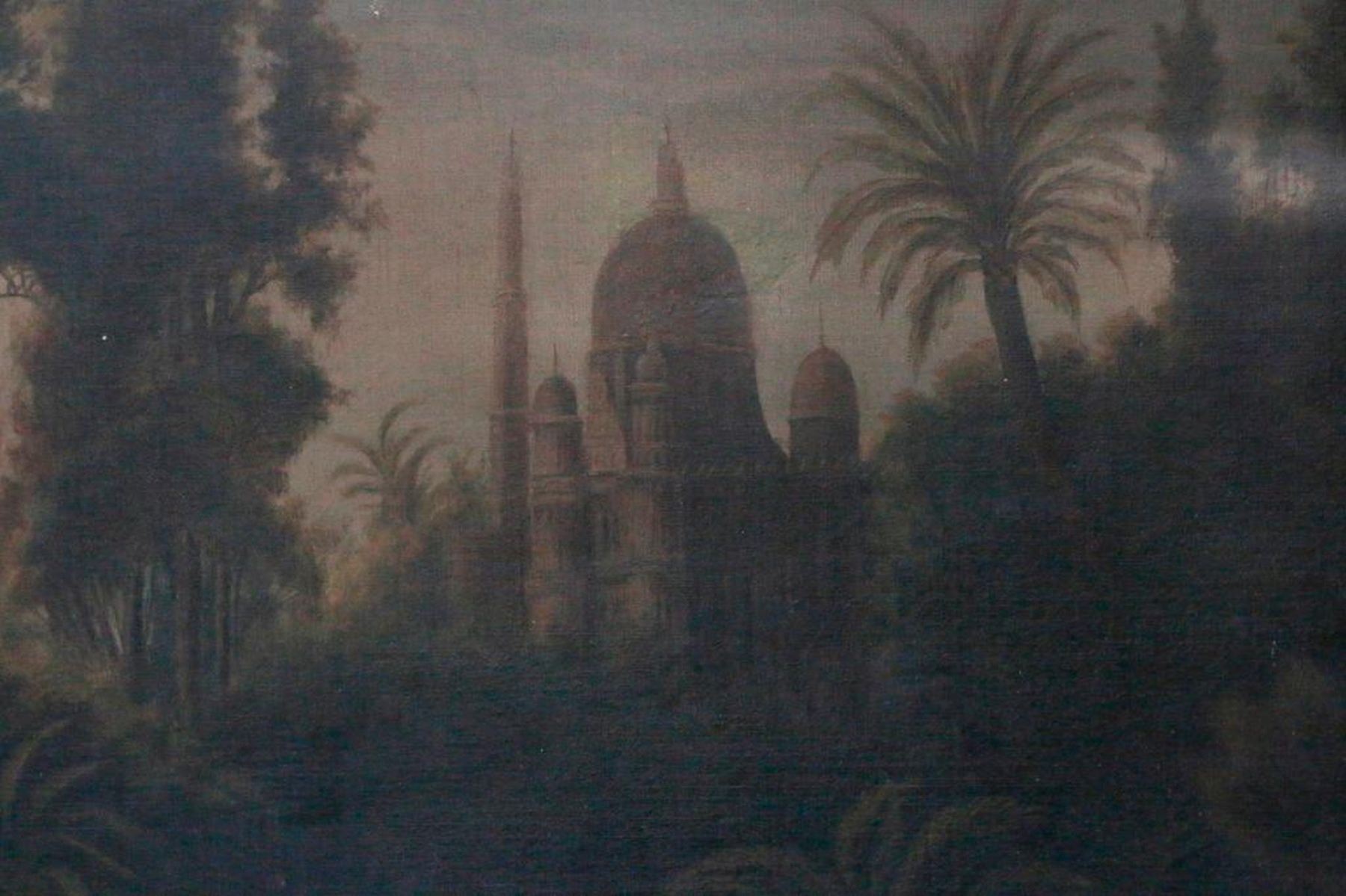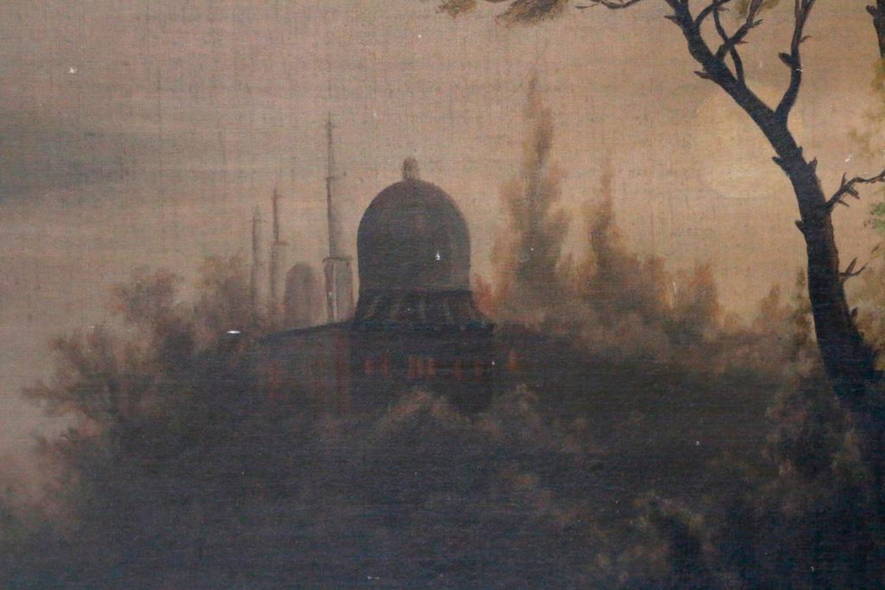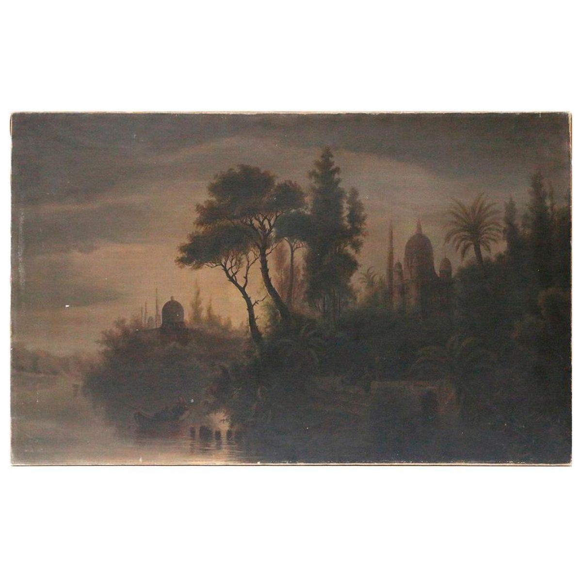Artist: Unsigned. Subject/Title: Night scene of a river view of the rear of the Taj Mahal. Date Created: 19th century. Medium: oil on canvas. Size Image: 24 inches high x 38. Size Frame: Unframed. Condition: Good Small scratch to middle left.