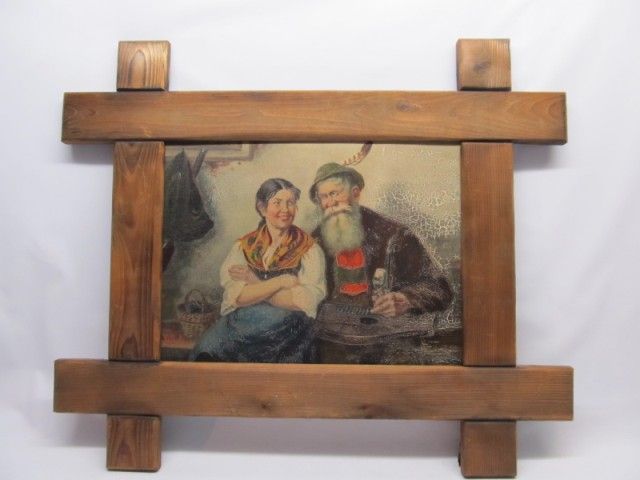 Oil on masonite "European Couple" in simple wood frame signed bottom left. 15 x 10 1/2 inches.