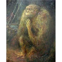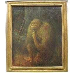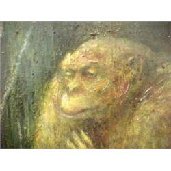 Oil on masonite panel, signed (unreadable), "The Monkey Beggars, The Watcher", framed, image measures 27 1/4" x 22 1/4"