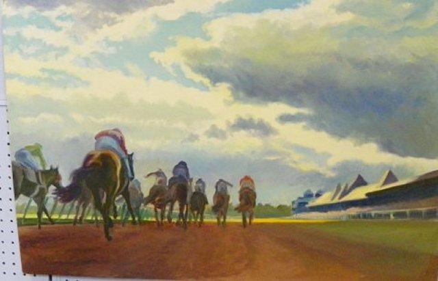 "At the Horse Races", on canvas, unframed. Approx. 23.75" x 36". Please read our terms of sale.
