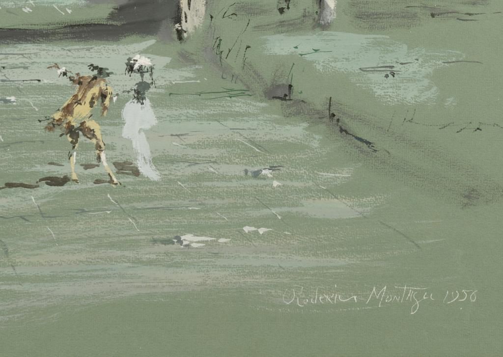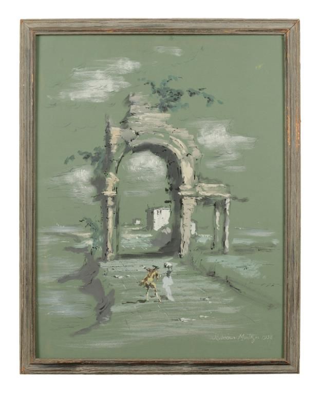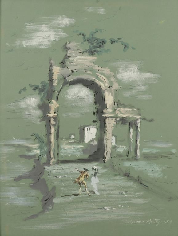 Oil painting on board signed lower right Roderick Montagu and dated 1956. Measures approximately 26”x20”. Modernistic and fanciful, artist was known to incorporate architectural elements. Listed well and fetches up to $850 in this size.Est.: $150-$300