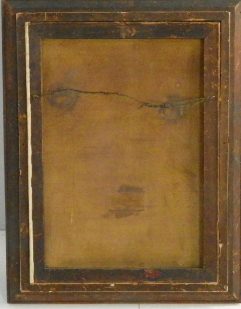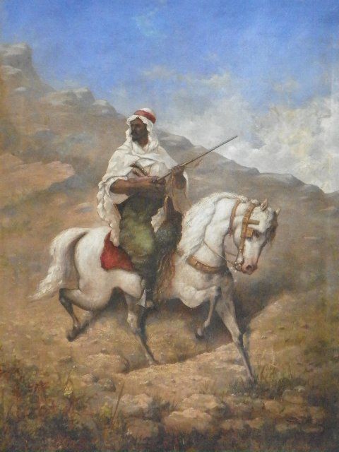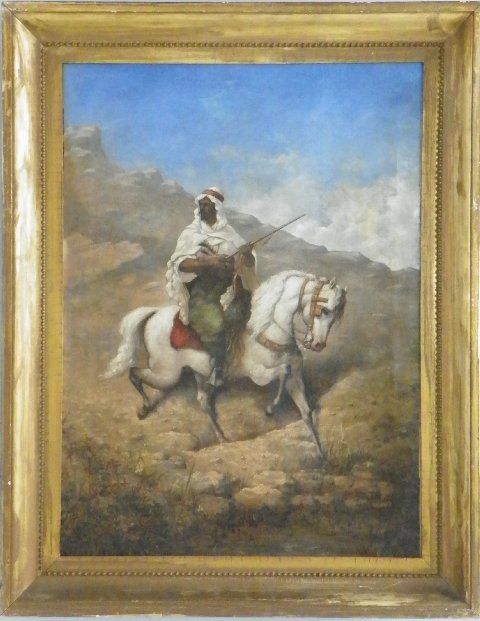 "Arab on Horse". Patches on back Approx. 22" x 30.5" canvas, 28" x 36" gilt frame. Please read our terms of sale.