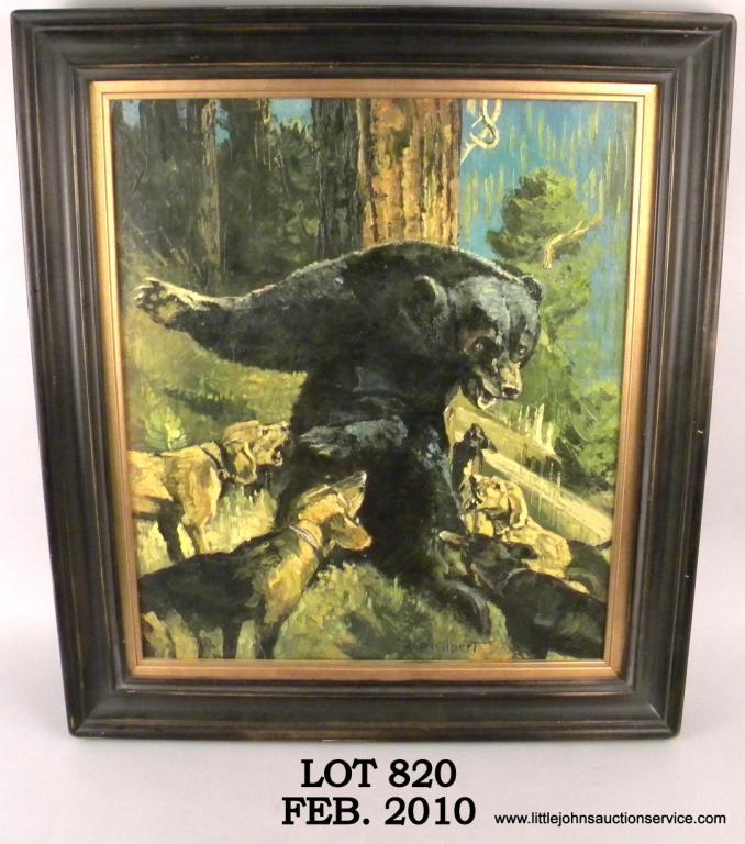 Oil painting on canvas of bear being braced by dogs signed R.P. Kilbert. The painting measures 21" x 18" and is in an old period frame. R.P. Kilbert is a well regarded American artist who died in 1946 and his works are sought after by collectors. He exhibited in 1900 at Chicago Academy of Art and received a gold medal and also San Francisco Art Academy 1935 where he received another gold medal. He studied at the Art Institute of Chicago and Academie Julien in Paris and Laurens in Munich. Est.: $1,250-$2,500.