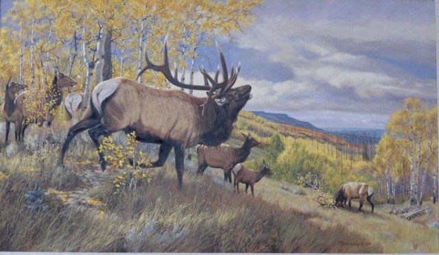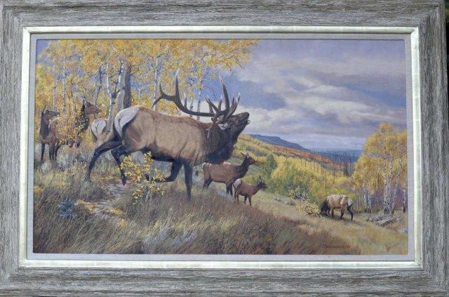 Oil painting on canvas showing old bull elk bugling and younger elk readying his horns for a fight over five (5)females who accompany the elder elk. Signed T. Beecham 93 lower right. Approximately 29”x49” nocondition problems, near mint, nicely framed and matted. Tom Beecham is very well recognized and handled by major art galleries in Jackson Hole and throughout the West. A major and impressive work. From the RobertE. Petersen Estate. Est.; $3,500-$7,000