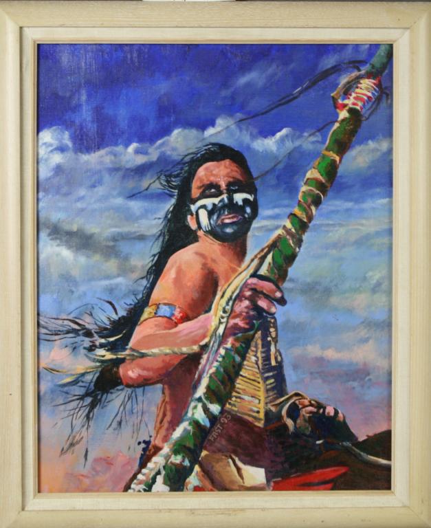 Oil painting on canvas signed “Fast 93” approx. 24” x 19” of an Indian warrior on horseback with war paint and lance. Est.: $50-$100.