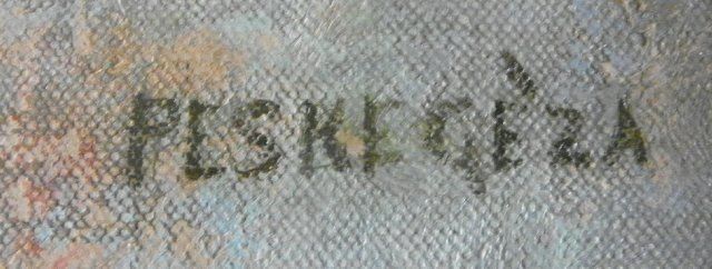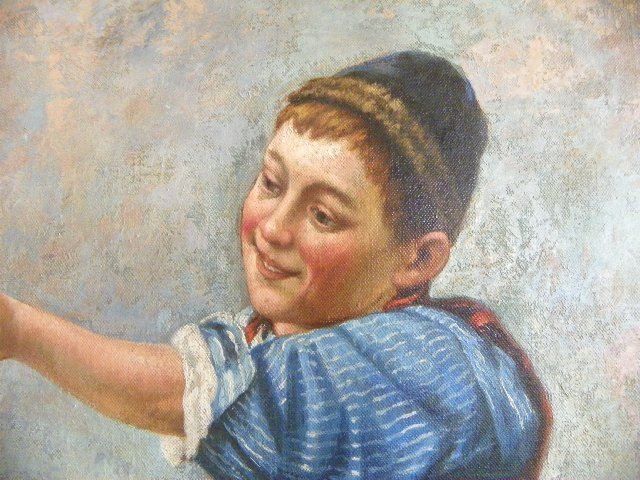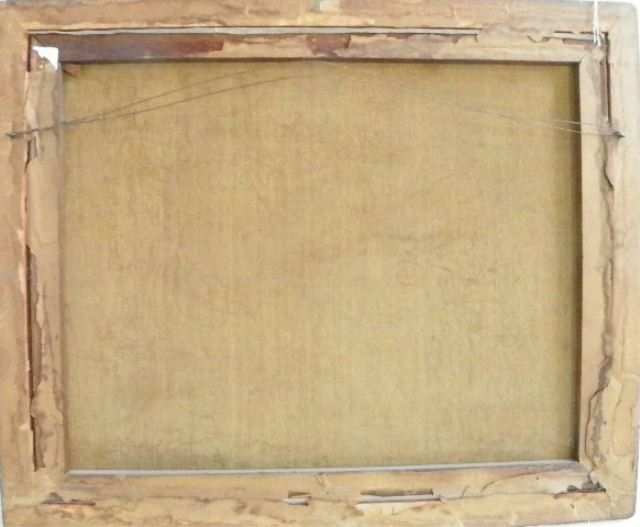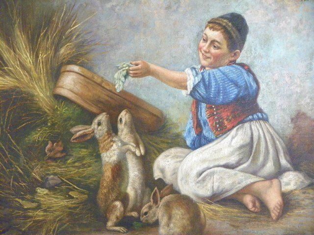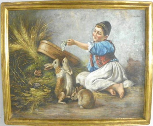 "Young Girl Feeding Rabbits". Approx. 25" x 31 1/8".
