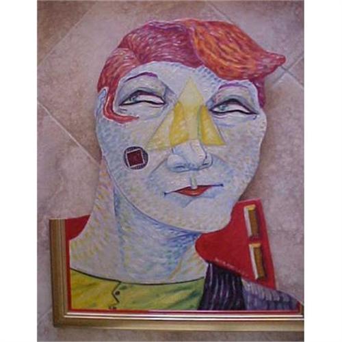 The originality of the painting is the fact that the person painted on a wood plank is cut from the background (Portrait Decoupe) so the background of the painting becomes your wall.