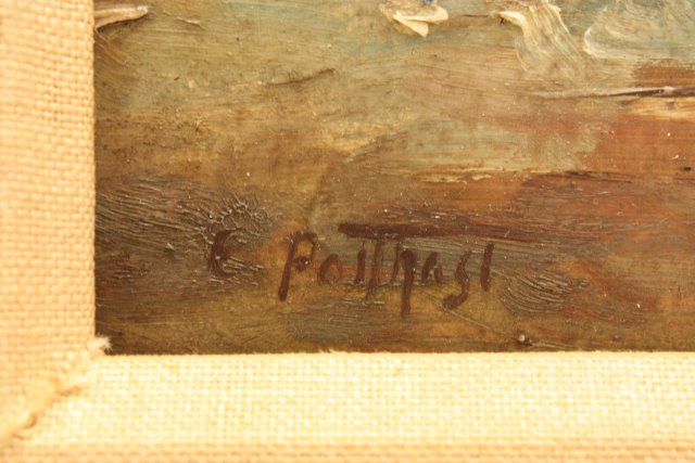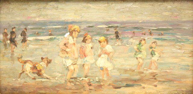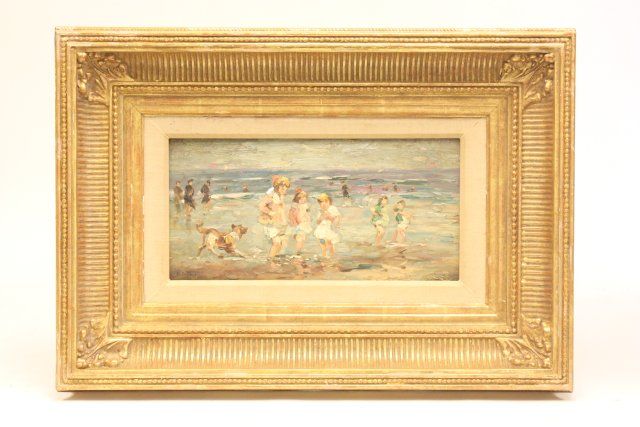 "2 Children on Beach with Dog", on board, board has warping, gilt frame. Edward Henry Potthast, American, 1857-1927. Framed approx. 18" x 26", board 8" x 16". From a LI, New York estate. Please read our terms of sale.