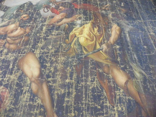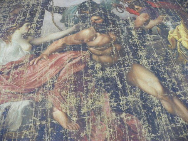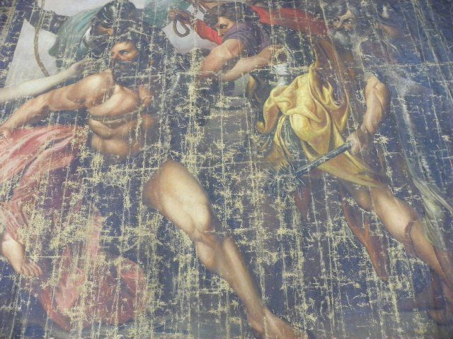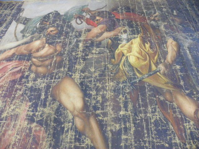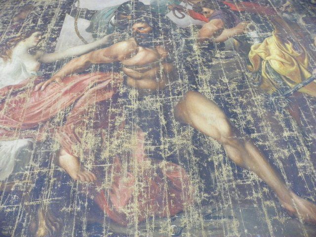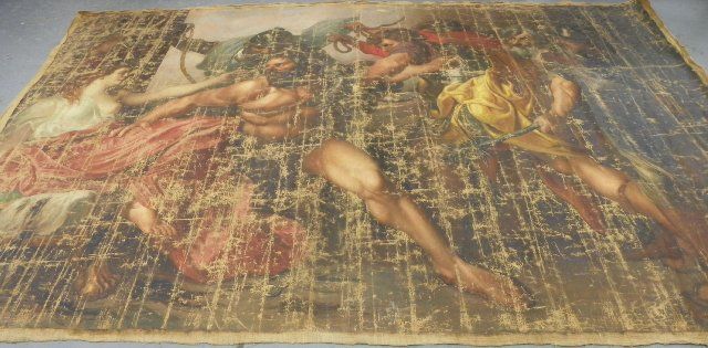 Depicting "Samson & Delilah", unframed, oil on canvas, signed lower left, date unreadable, very worn. Approx. 11' W x 9'3" H. Please read our terms of sale.