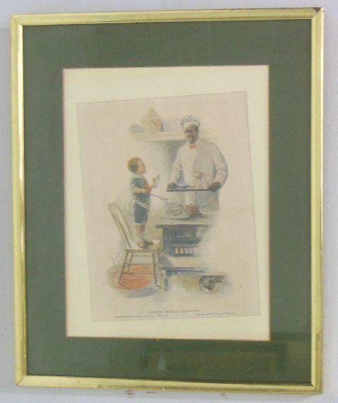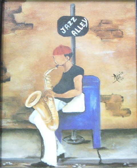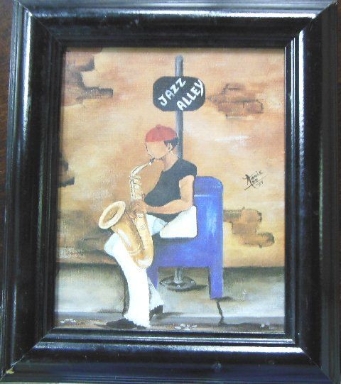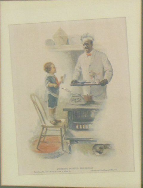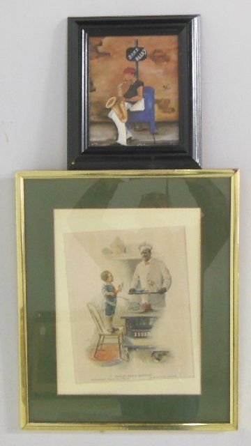 1- Oil painting on canvas, "Jazz Alley", signed, framed approx. 14" x 11". 1- Colored print "Cream of Wheat", framed.
